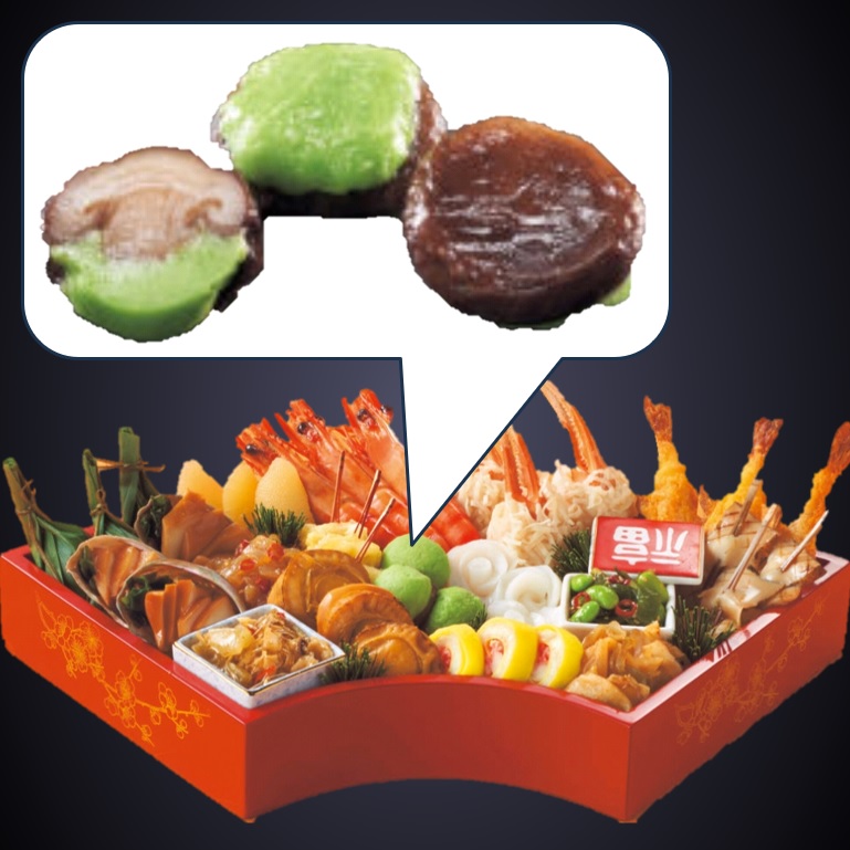 しいたけ煮に、ほうれん草できれいな緑に色付けしたすり身を鋳込みました。