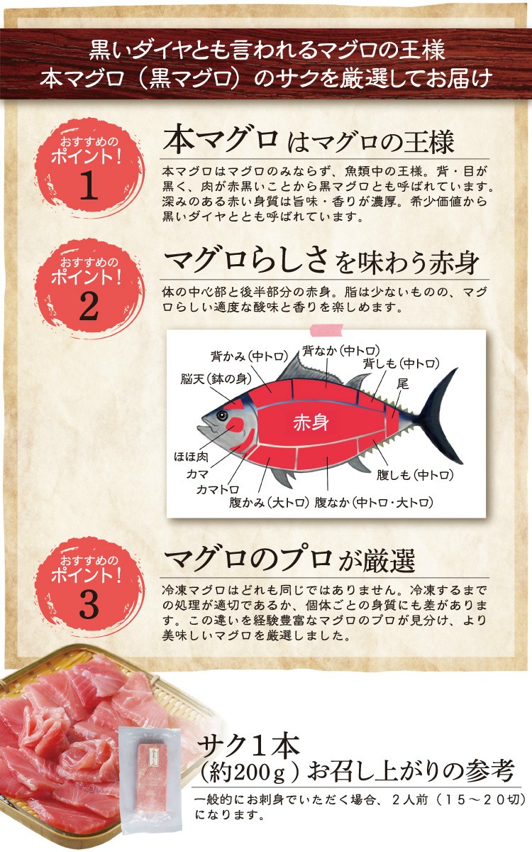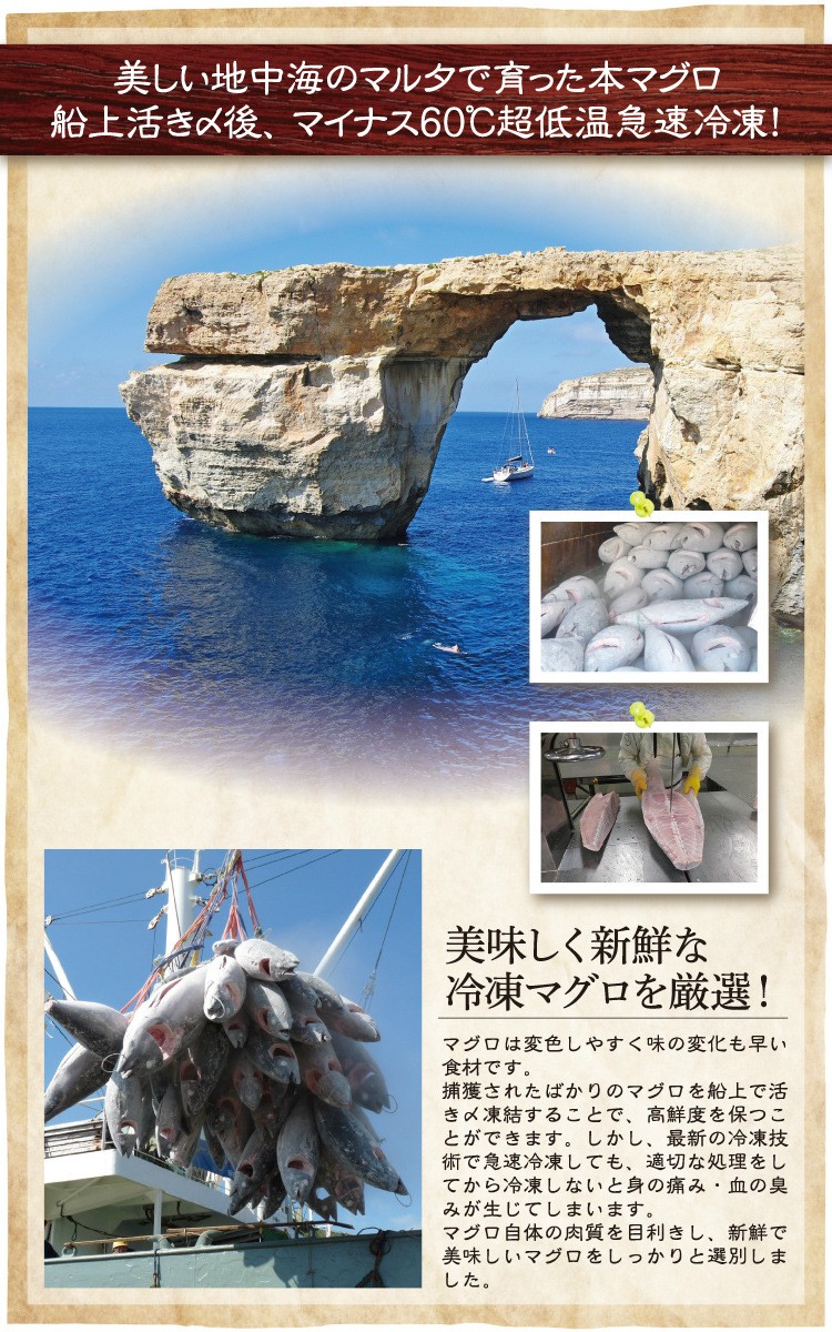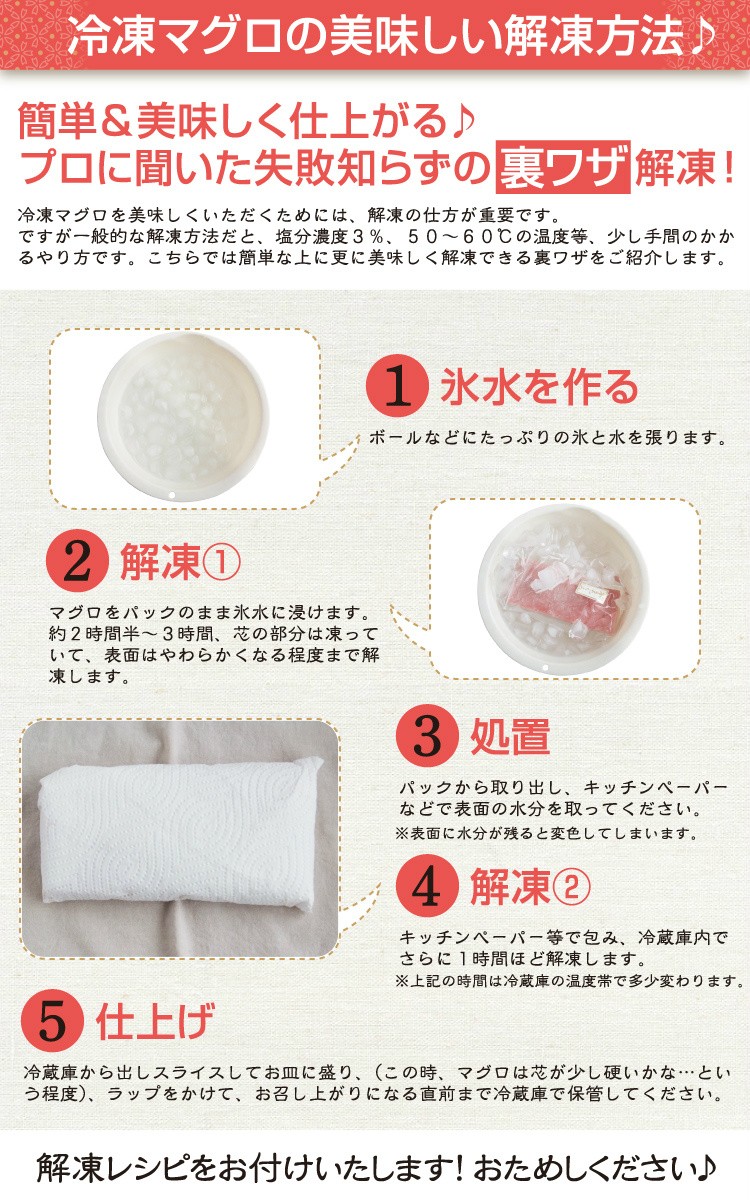◎お召し上がり方:マグロの品質はマイナス50度の超低温冷凍で保たれます。ご家庭の冷凍庫の温度ですと、2〜3日で変色してしまいます。