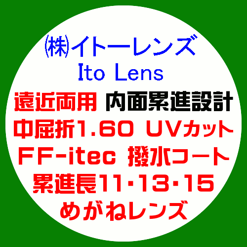 遠くから近くまでを境目なしでカバーする内面累進設計(境目のない)中屈折1.60 紫外線(UV)カットの遠近両用レンズです。(遠用、近用度数が、「弱級度数」から「中級度数」の方にお勧めです。)滑らかな度数変化で、遠近両用初心者の方でもお勧め出来るレンズです。