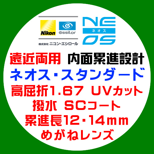 そのネオス・スタンダードは、遠くから近くまでを境目なしでカバーする内面累進設計(境目のない)高屈折1.67 紫外線(UV)カットの遠近両用レンズです。(遠用、近用度数が、「中級度数」から「中強級度数」の方にお勧めです。)