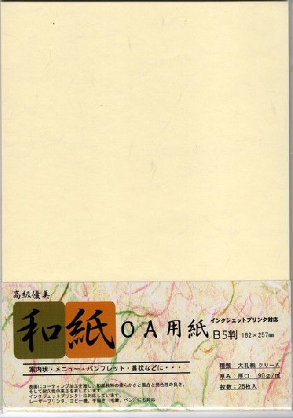 和紙OA用紙 大礼紙 クリーム色は、表面にコーティング加工を施し、和紙独特の柔らかさと風合いと発色性の良さ、そして耐久性の高さを有しています。 インクジェットプリンター、レーザープリンター、コピー機、手書きの毛筆、ペンに対応しています。 大礼紙とは、昭和3年の昭和天皇の即位式のために越前で作られた和紙です。 大礼紙は、即位式の封筒や便箋として使用されました。 和紙としての大礼紙は、楮の長い繊維を漉き込み、見た目には雲龍紙によく似ています。 賞状、案内状、メニュー、パンフレット、貼り絵の地紙としてもご使用いただけます。 | ||||||||||||||||||