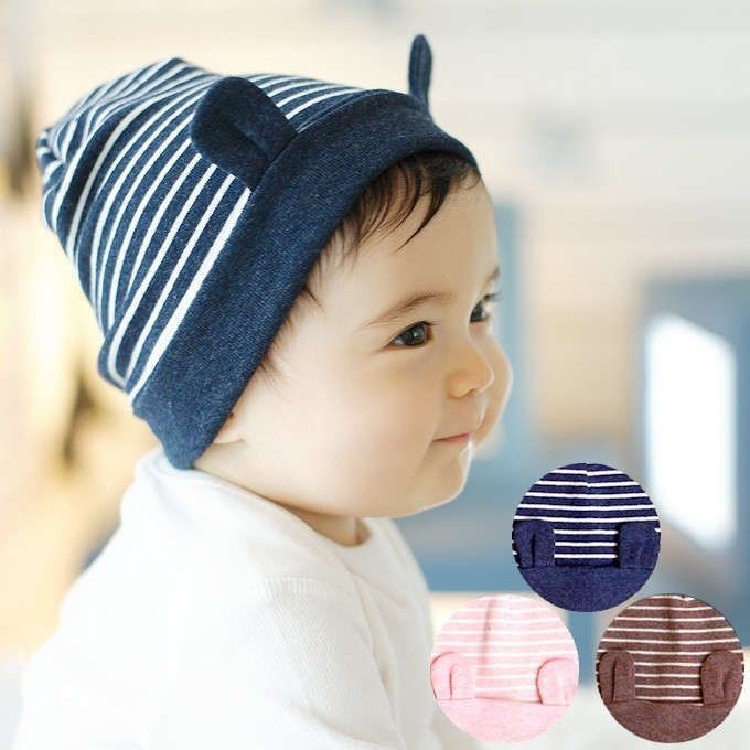 ボーダー柄くま耳付のかわいいベビー用ボーダー柄帽子!