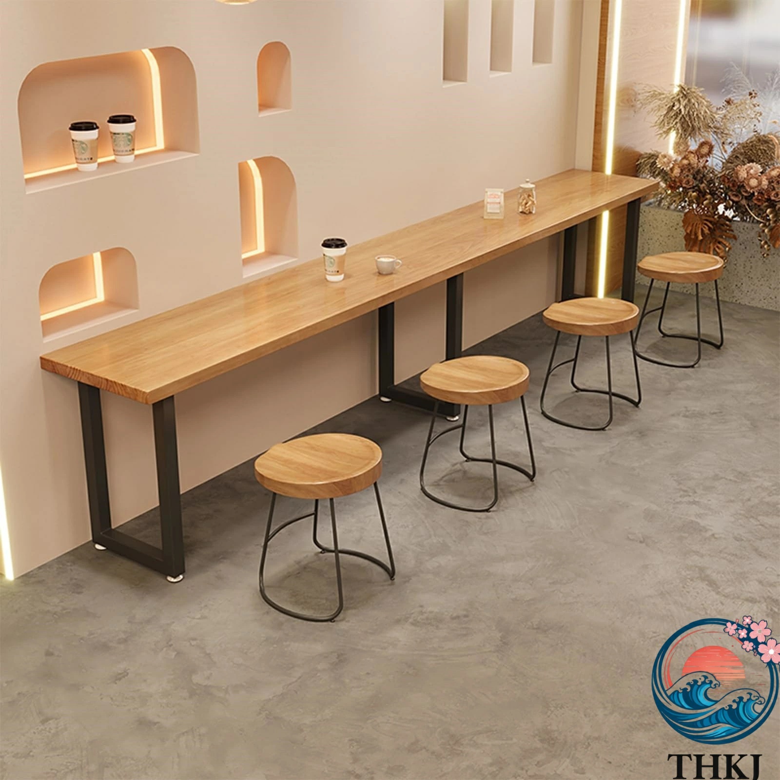 長方形 無垢材バーテーブル モダン 長いコーヒーバーテーブル キッチン補助テーブル サイドテーブル ソファー用 黒鉄製ベース付き