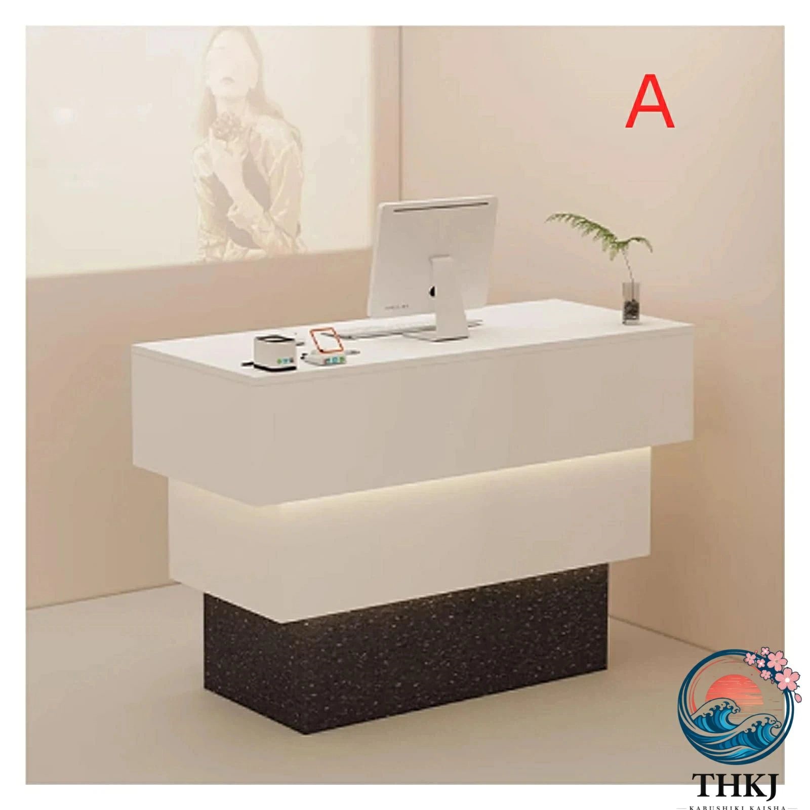 ? 4. プロフェッショナルな外観: このモダンな受付デスクは、現代的で洗練された雰囲気を演出します。顧客や来客に好印象を与え、ビジネス環境を向上させます
