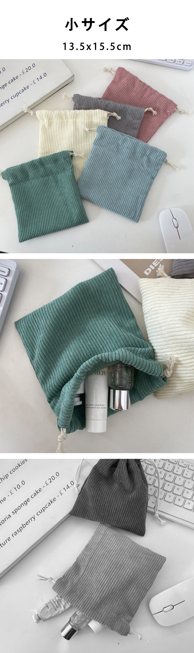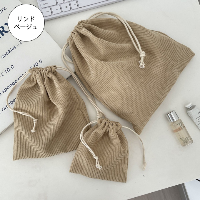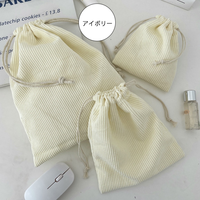 巾着 コーデュロイ ミニポーチ 布巾着 大中小 3点セット ポーチ トラベル 旅行 タオル 下着 コスメ アクセサリー イヤホン コード 薬 小物収納 化粧品 アイボリ