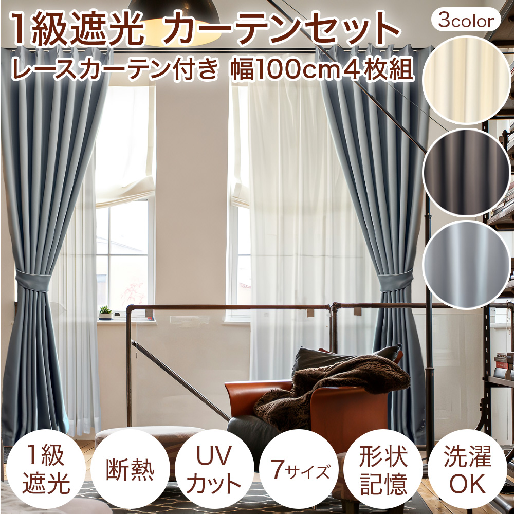 1級遮光 無地 カーテン レース付き 4枚set 幅100cm 丈135 150 178 190 200 210 220 北欧 遮熱 保温 UVカット 形状記憶加工 洗える レースカーテン 4枚組 爆買