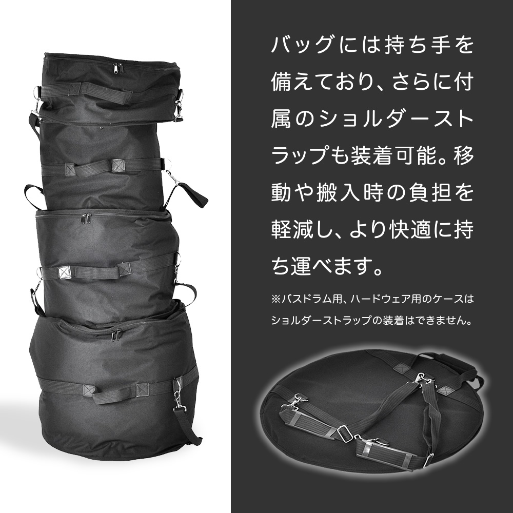 バスドラム及びスタンドケースは手さげのみ、それ以外はベルトと手さげが両方ともついています。