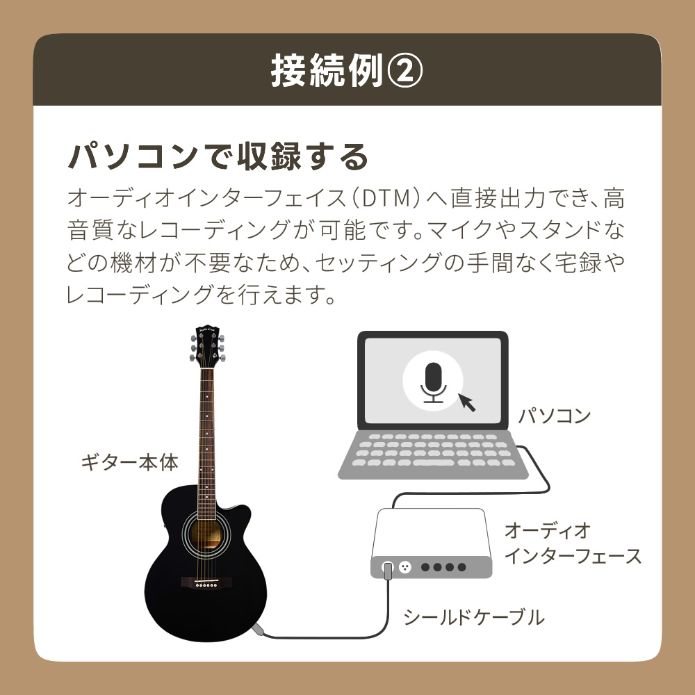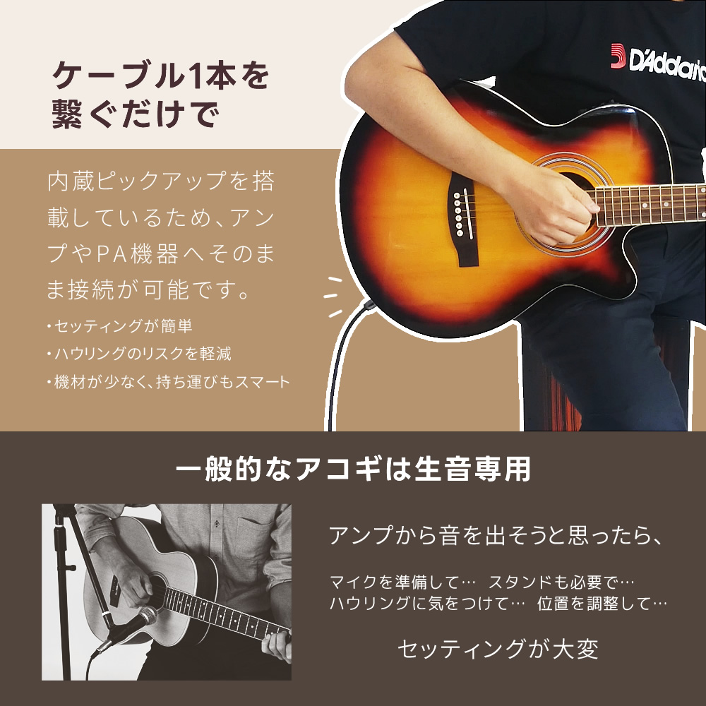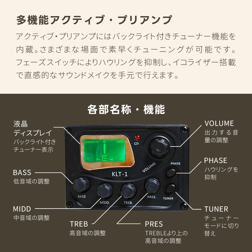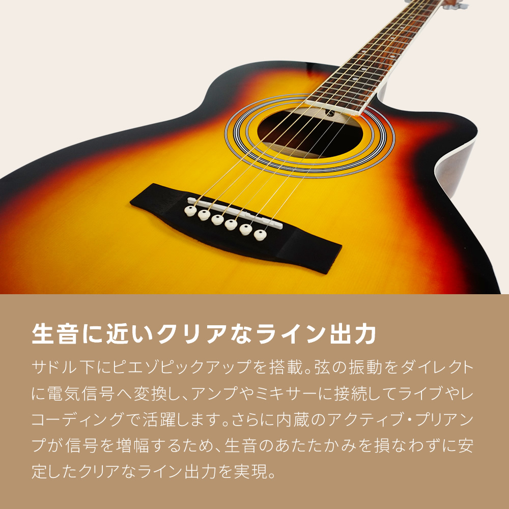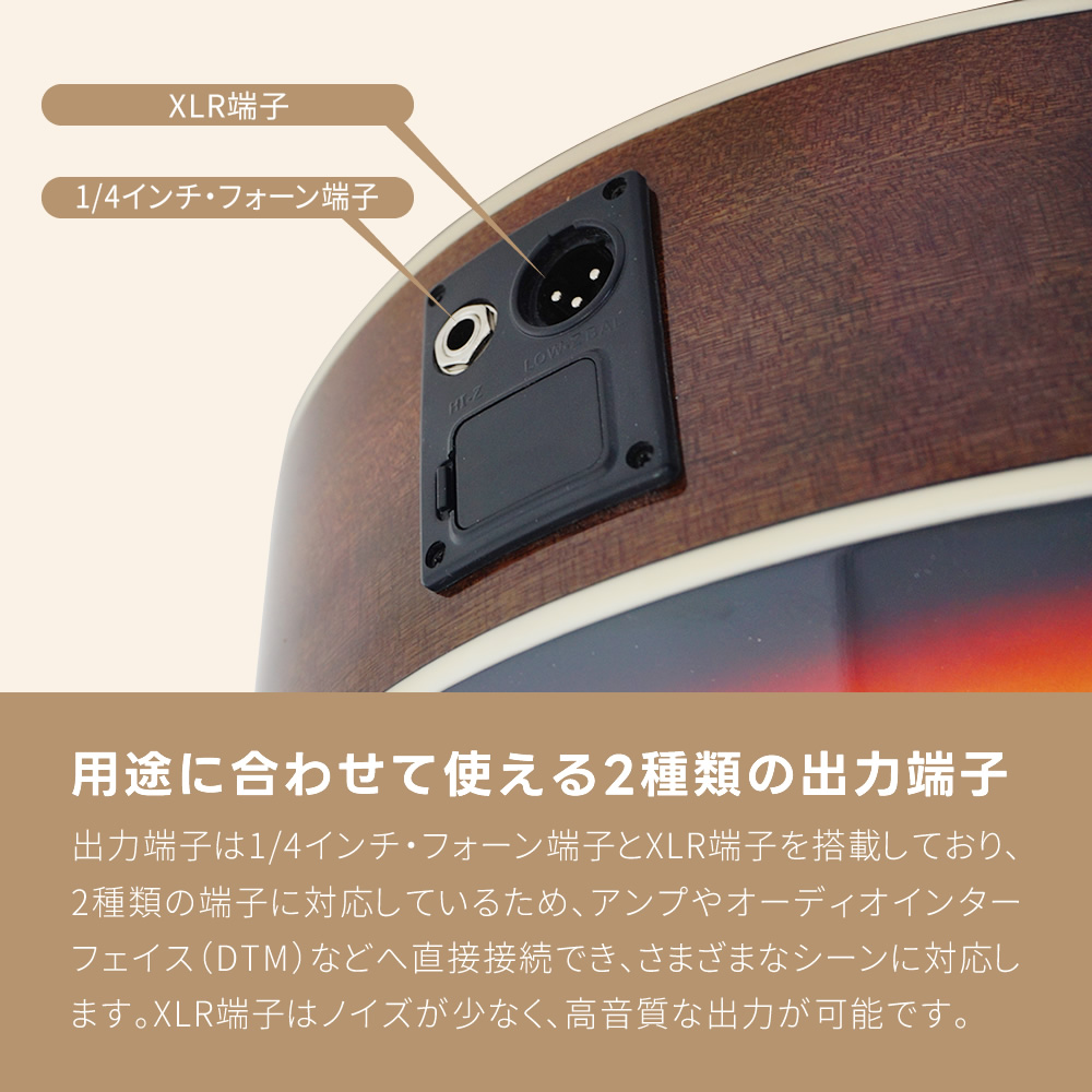 アコースティックギターとしても使用でき、アンプや機材と接続すればライブやレコーディング、DTMの際も大活躍します!出力端子は1/4"フォン端子とXLR端子を搭載しており様々な場面に対応します。新たに採用されたアクティブ・プリアンプにはバックライト付きのチューナー機能を搭載しております。