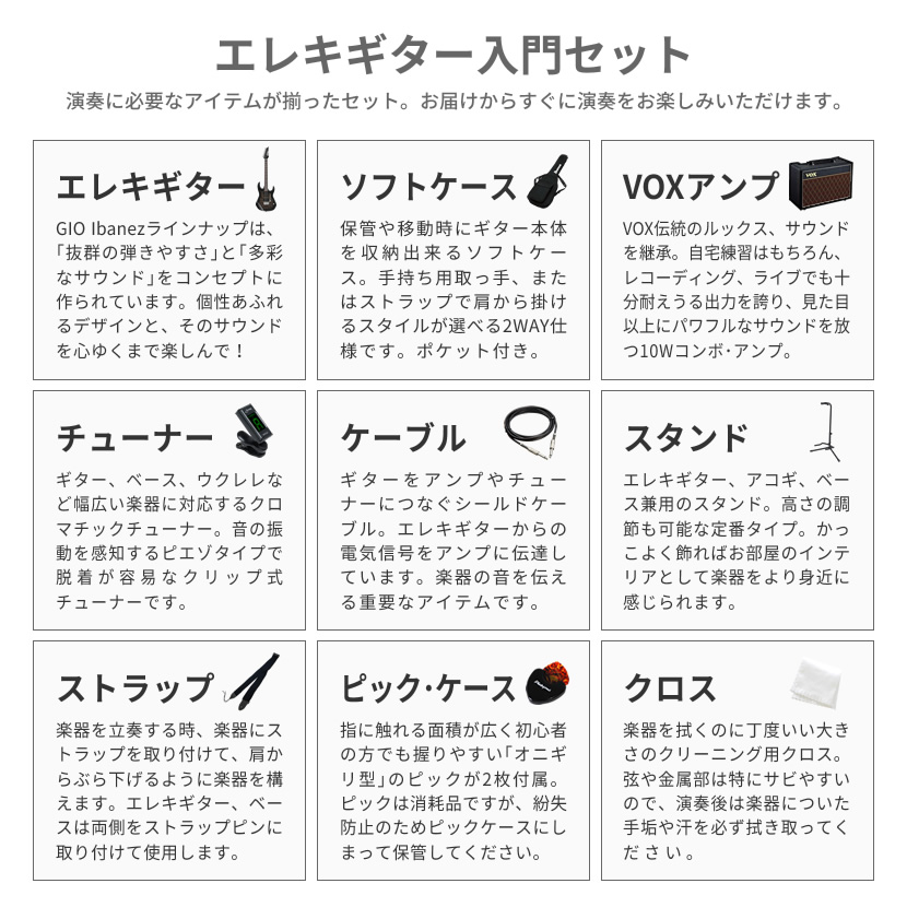 エレキギター本体 / 本体用ソフトケース / VOXギターアンプ Pathfinder10 / クリップチューナー / シールドケーブル / スタンド / ストラップ / ピック・ピックケース / クロス