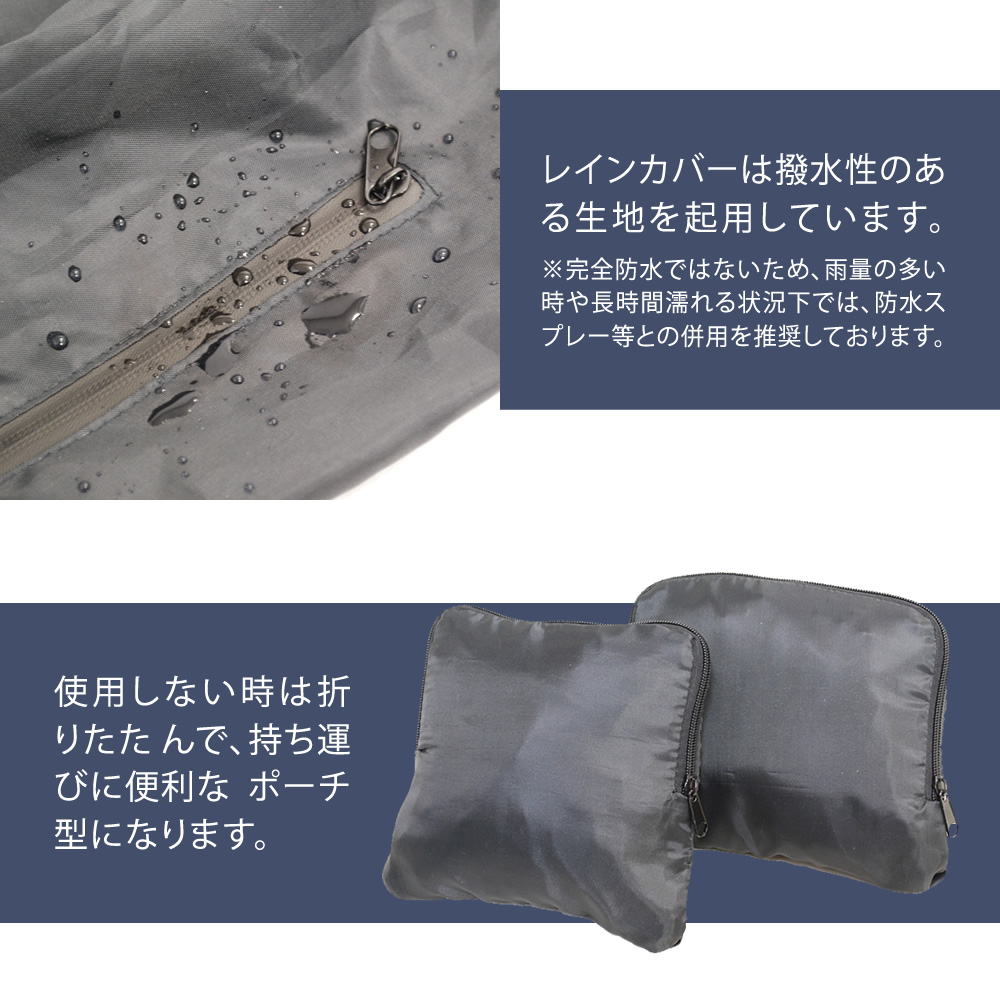 レインカバーは撥水性のある生地を起用しておりますが、完全防水ではありませんので、雨量の多い時、長時間濡れる状況下では、防水スプレー等との併用を推奨します。