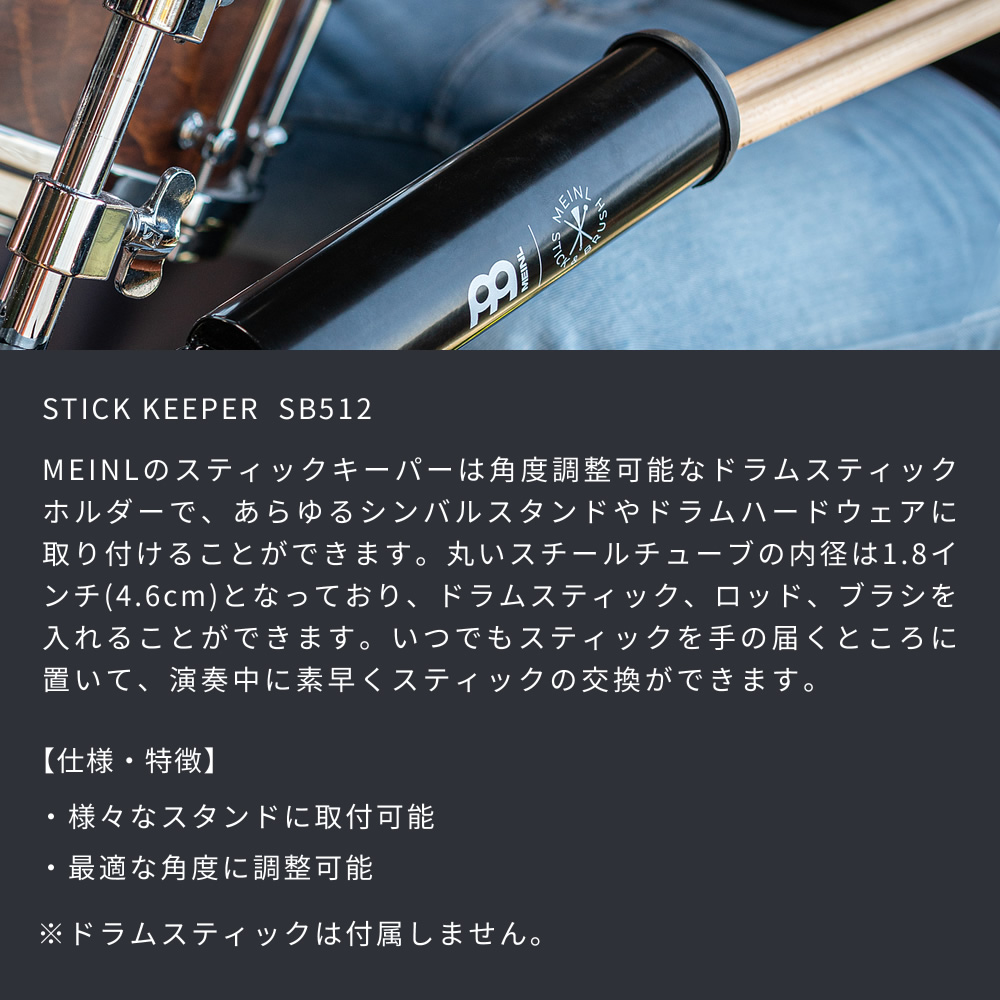 MEINLのスティックキーパーは角度調整可能なドラムスティックホルダーで、あらゆるシンバルスタンドやドラムハードウェアに取り付けることができます。丸いスチールチューブの内径は1.8インチ(4.6cm)となっており、ドラムスティック、ロッド、ブラシを入れることができます。いつでもスティックを手の届くところに置いて、演奏中に素早くスティックの交換ができます。