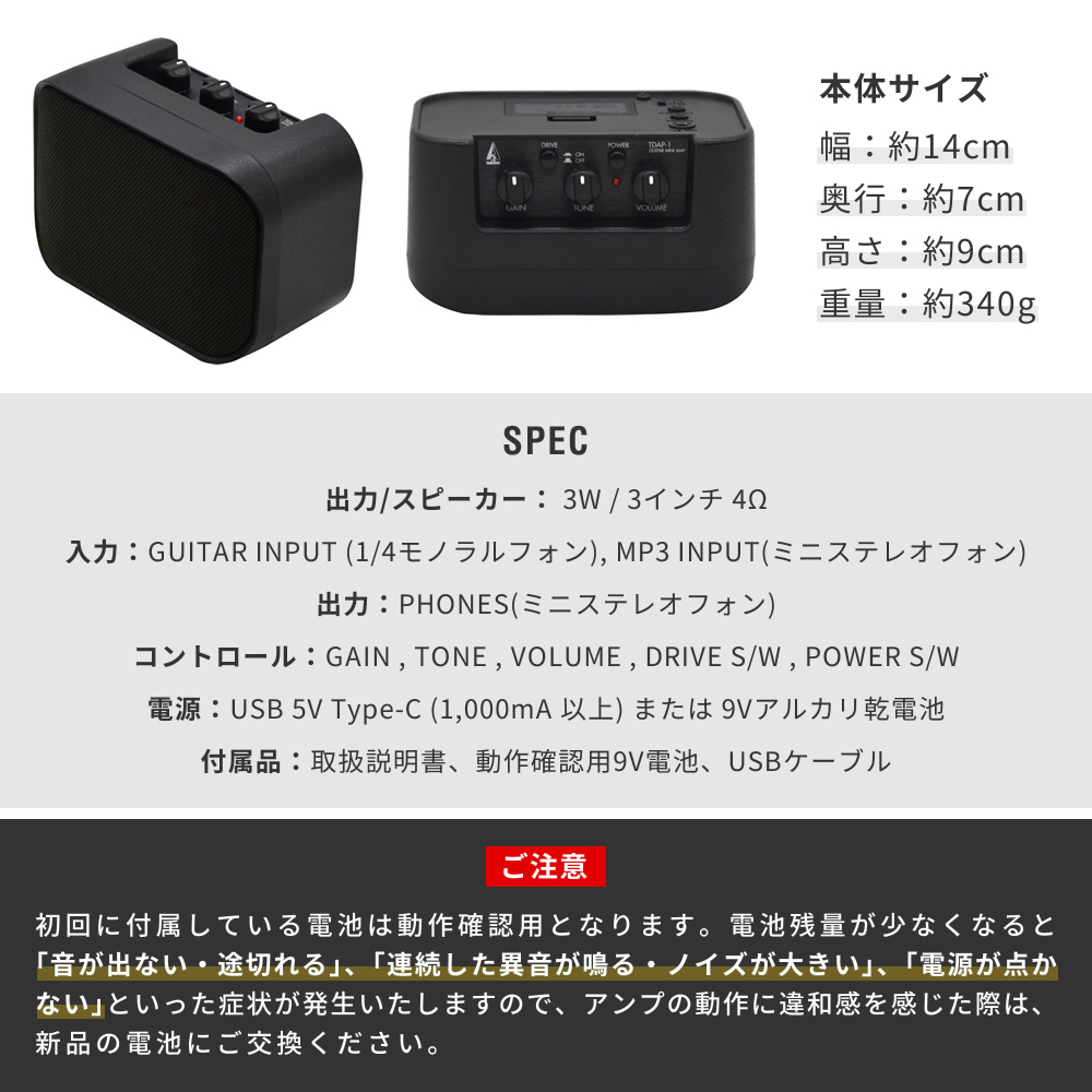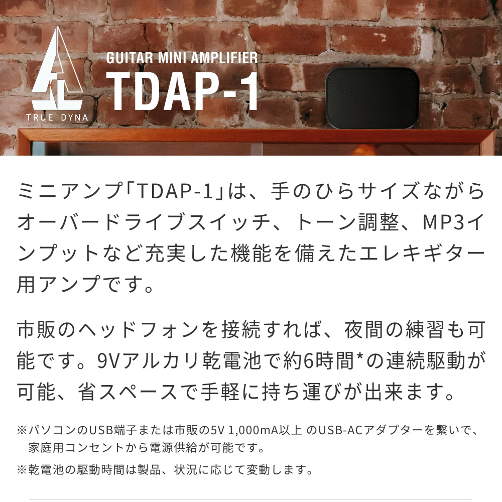 ミニアンプ「TDAP-1」は、手のひらサイズながらオーバードライブスイッチ、トーン調整、MP3インプットなど充実した機能を備えたエレキギター用アンプです。