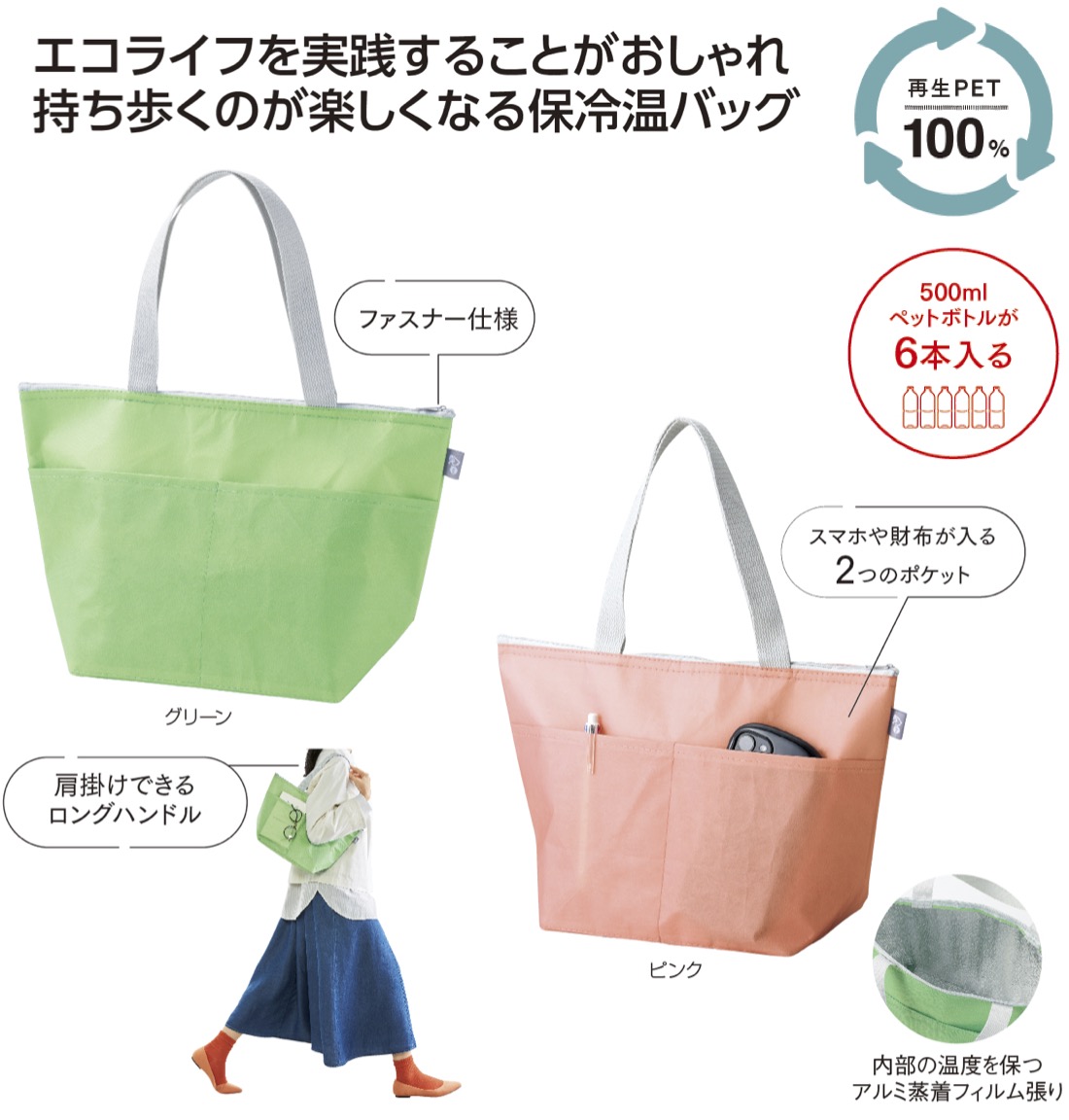 環境にやさしい再生PET生地の保冷温バッグ。前面にスマホや財布などが入るダブルポケット付。さらに肩掛けがしやすいロングハンドル仕様!