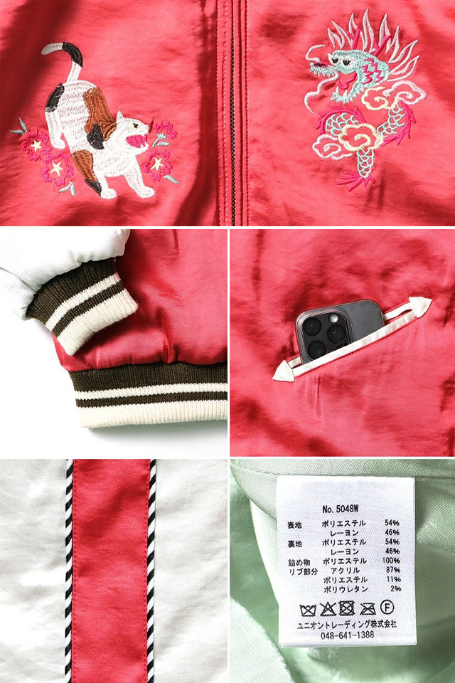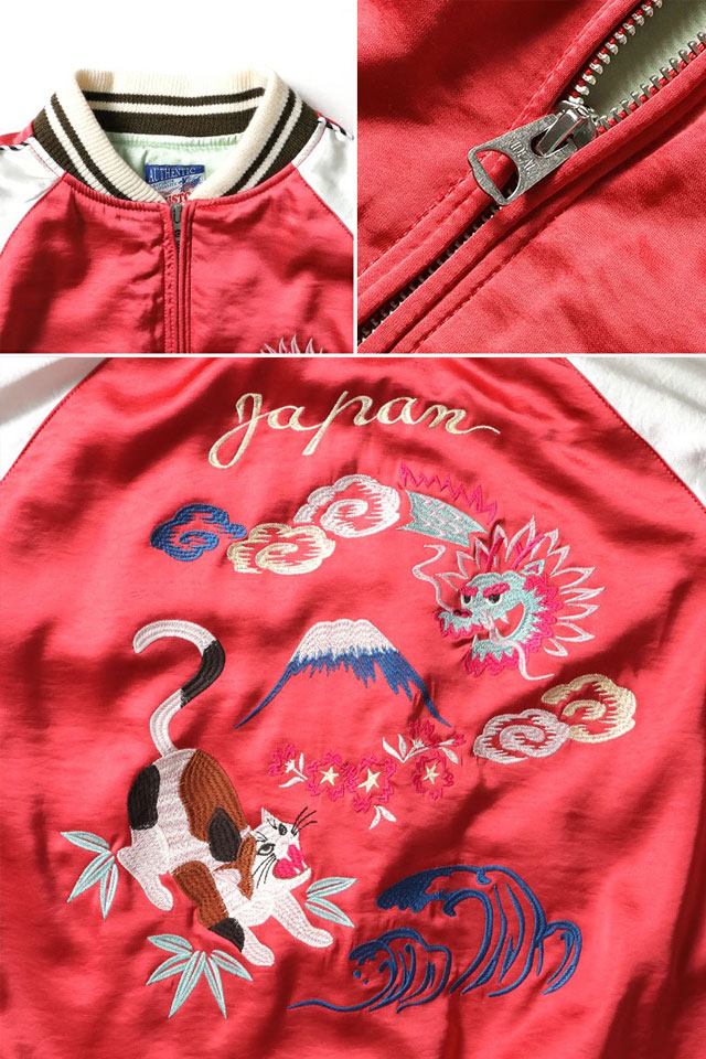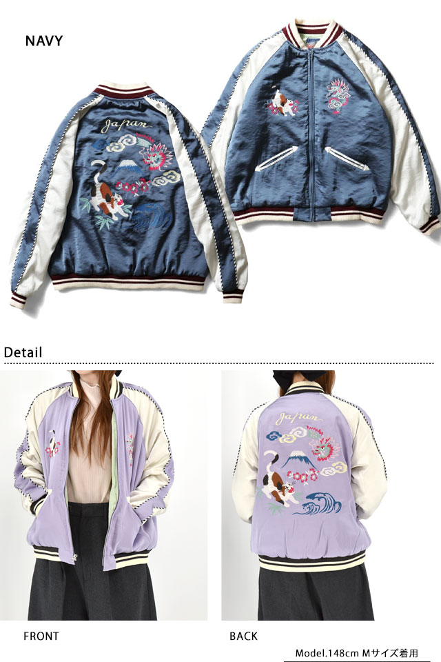 日本で初めてオリジナルのフライトジャケットを生み出し、その後も数々の国内製ミリタリー商品を製造する「ヒューストン」から、猫柄スカジャン/SOUVENIR JACKET「CAT」/レディース(5048W)のご紹介です。 人気のスカジャンをオリジナルの刺繍で展開。 和テイストを取り入れつつ、スカジャンの定番の龍と可愛らしい猫を組み合わせた柄をデザインです。 程よくコンパクトなシルエットでスカートなどボリュームのあるボトムスとも合わせやすい女性が着やすいスカジャンです。 | ||||||||||||
