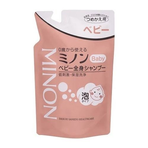 「ミノン ベビー全身シャンプー つめかえ用 300ml」は、植物性アミノ酸系洗浄成分配合、肌本来のうるおいを落としすぎず、余分な負担をかけにくいベビー用ボディシャンプーです。製薬会社が皮膚科学に基づいて開発した低刺激性処方。弱酸性。無香料。