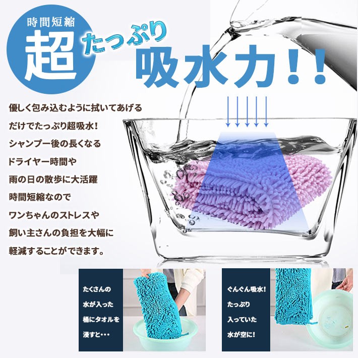 ワンちゃんネコちゃんの体を優しく包み込むように拭いてあげるだけで水分を一気にたっぷり吸水!
