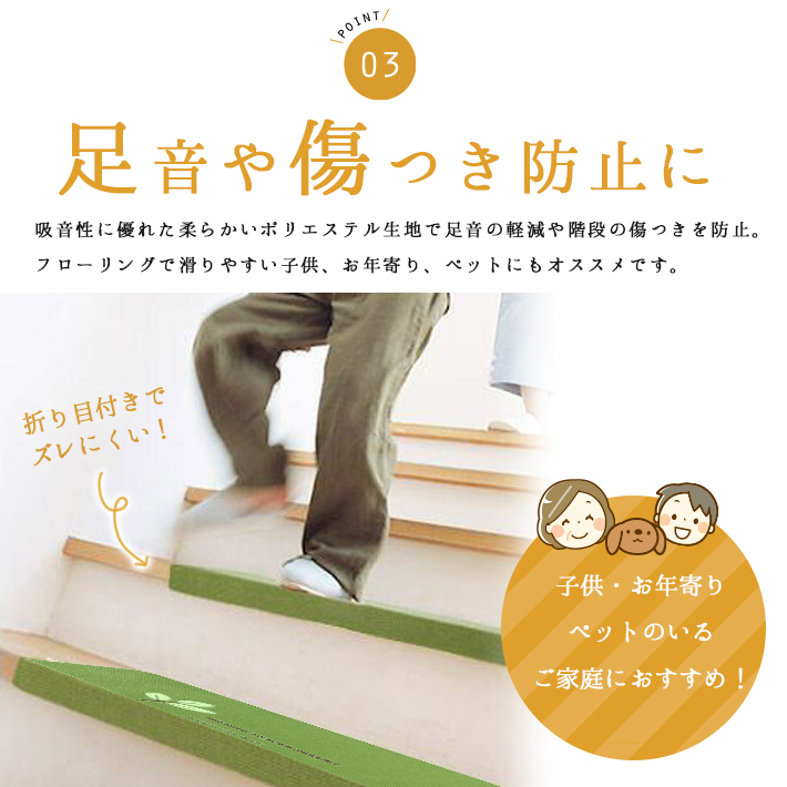 また、吸音性に優れた柔らかいポリエステル生地なので足音の軽減にもなります。