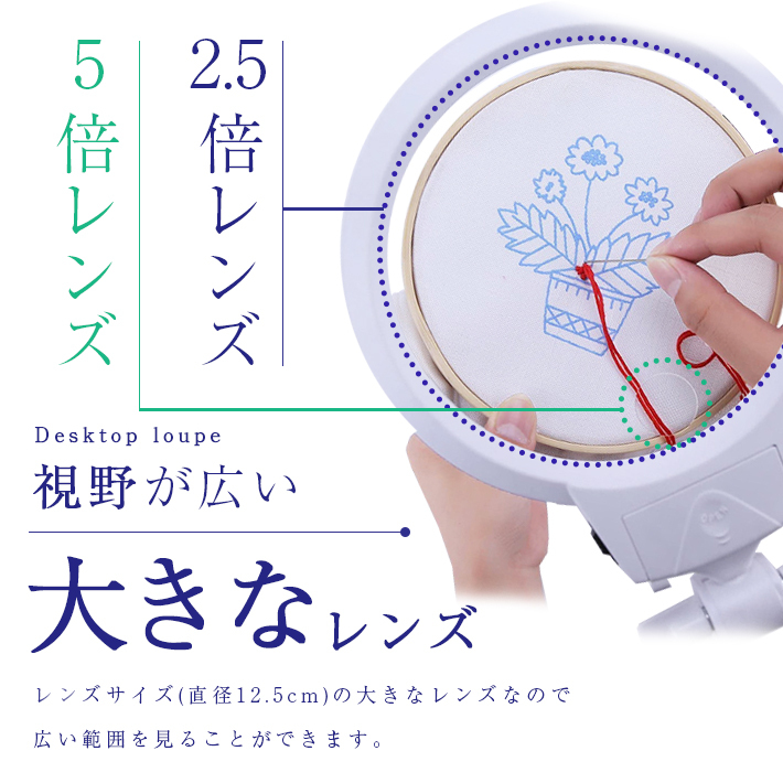 ルーペ 卓上 スタンド LEDライト搭載タイプ 5倍 & 2.5倍 大きめレンズ 直径12.5cm 3箇所稼働フレキシブルアーム 乾電池使用 拡大鏡 虫眼鏡