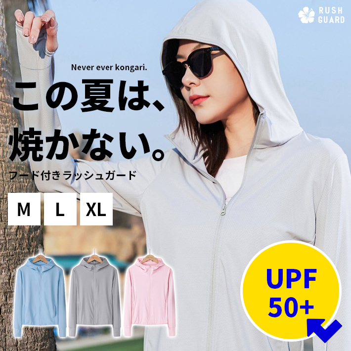 夏のレジャーや屋外スポーツに大活躍するフード付きのラッシュガード。
