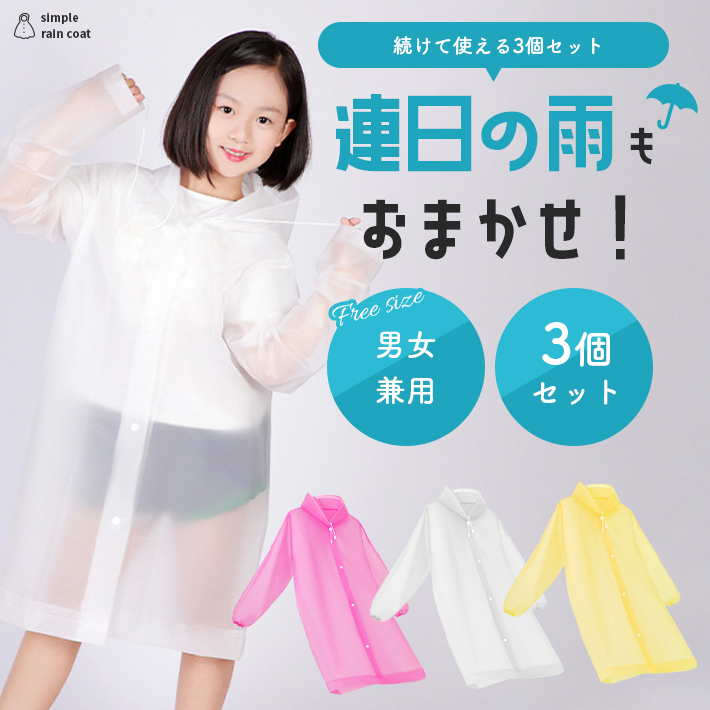 レインコート キッズ 「3着セット」 袖ゴム コンパクト レインポンチョ レインウエア カッパ 雨具 かっぱ 女の子 男の子 小学生 子供