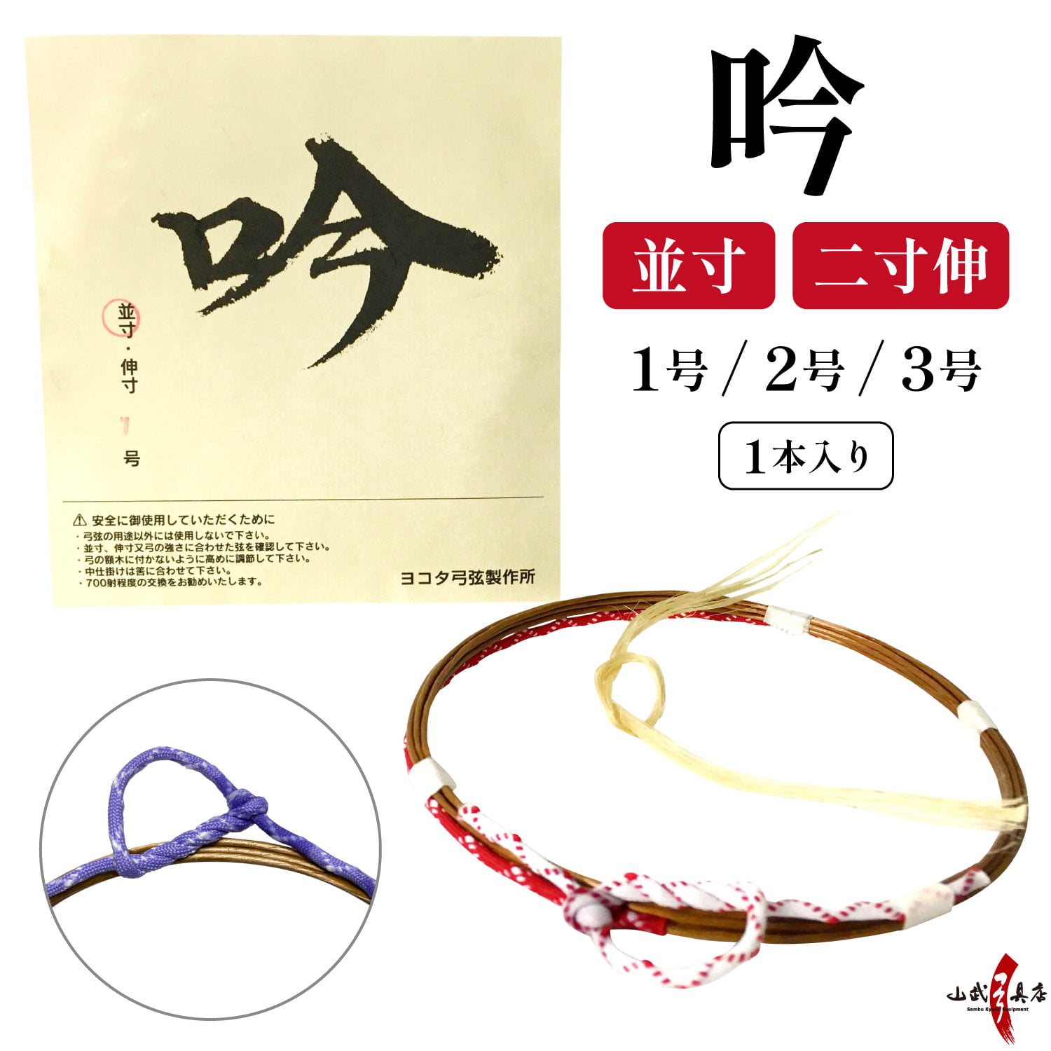 | サイズ | 並寸・二寸伸 | | 弦の太さ | 1号・2号・3号 | | 材質 | 高弾性アラミド繊維 |