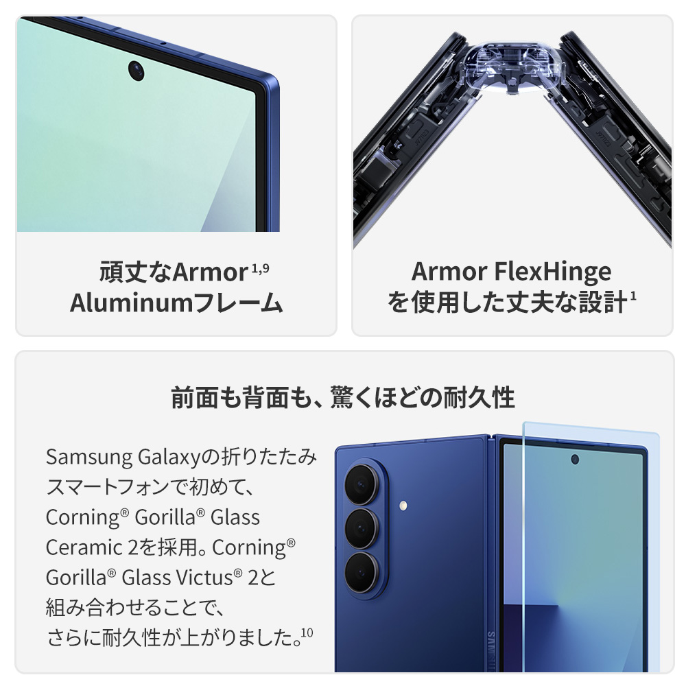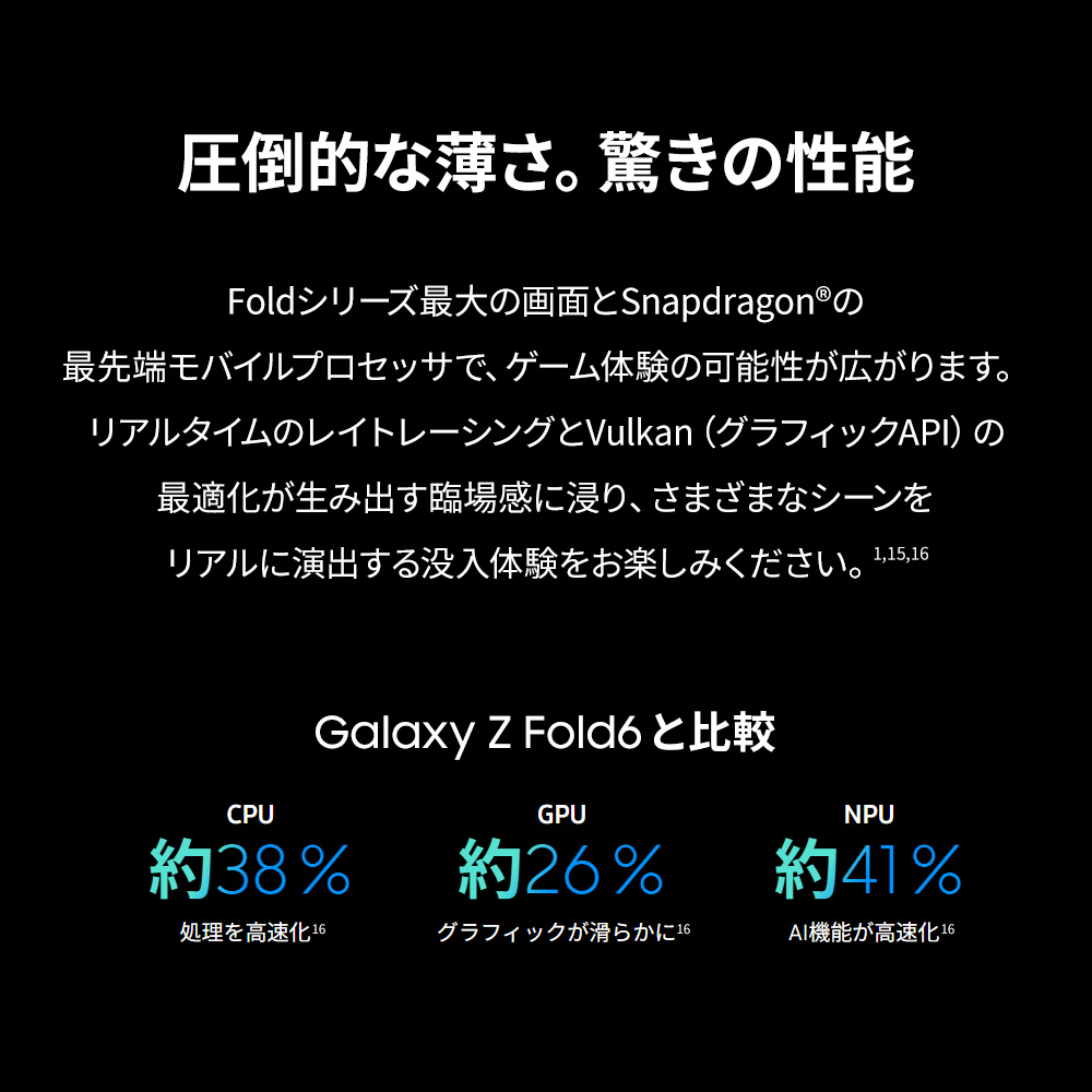 | *画像はイメージです。実際のUX/UIとは異なる場合があります。 *一部のGalaxy AIの機能の使用には、Samsungアカウントへのログインが必要な場合があります。 1.Galaxy Z Foldの従来モデルとの比較。 2.実際のバッテリー駆動時間は、ネットワーク環境、使用する機能やアプリ、通話やメッセージの頻度、充電回数、その他の要因によって異なる場合があります。これは、UX Connect Researchがまとめた平均的な使用プロファイルに対して推定したものです。2025年6月12日(木)から2025年6月20日(金)に米国でSM-F966の発売前のバージョンを使用して、LTEおよび5G Sub6ネットワークをデフォルト設定にしたものをUX Connect Researchが独自に評価したものです。5G mmWaveネットワークでのテストは行っておりません。 3.発売前の所定のモデルをBluetoothでイヤホンに接続し、初期設定のままLTEで通信した場合のSamsung社内試験条件によるものです。バッテリー容量と、動画再生中(動画ファイル解像度720p、デバイスに保存)のバッテリー消費電力で測定された電圧に基づく推定値。実際の動画再生時間は、ネットワークの接続状況、設定、動画ファイルの形式、画面の明るさ、バッテリーの状態などさまざまな要因で異なる可能性があります。 4.標準値は第三者の研究所の条件下で試験されたものです。標準値とは、IEC 61960規格に基づく試験でのバッテリーサンプル間の容量偏差を考慮した、推定平均値です。Galaxy Z Fold7の定格容量は約4,272 mAhです。実際のバッテリー駆動時間は、ネットワーク環境、使用パターン、その他の要因によって異なる場合があります。 5.Galaxy Z Fold7のカバー画面のサイズは、対角線で測定した場合、完全な長方形で約6.5インチ、角の丸みを考慮すると約6.5インチとなります。角の丸みにより、実際の表示可能領域は対角線測定値より小さくなります。 6.Galaxy Z Fold7のカバー画面のサイズは、対角線で測定した場合、完全な長方形で約8.0インチ、角の丸みを考慮すると約8.0インチとなります。角の丸みにより、実際の表示可能領域は対角線測定値より小さくなります。 9.Advanced Armor Aluminumフレームには、音量やサイドキー、SIMトレイは含まれていません。 10.デバイスの前面にはCorning Gorilla Glass Ceramic 2、背面にはCorning Gorilla Glass Victus 2を使用しています。 11.重さは、国や地域により異なる場合があります。 12.Galaxy Z Fold3とGalaxy Z Fold4の厚さは、上のガラスパネルから下のガラスパネルまでが一番分厚い部分で測定したものです。 13.仕上がりは、照明環境や撮影状況(複数の対象物、ピンボケ、動く対象物など)により異なる場合があります。 15.Snapdragonは、Qualcomm Technologies, Inc.およびその子会社の製品です。Snapdragonは、Qualcomm Incorporatedの登録商標です。 16.記載されたモバイルAPのパフォーマンスの改善は、Galaxy Z Fold6と比較したものです。実際の性能はユーザーの環境、使用条件、プリインストールされたソフトウェアやアプリケーションによって異なります。 |