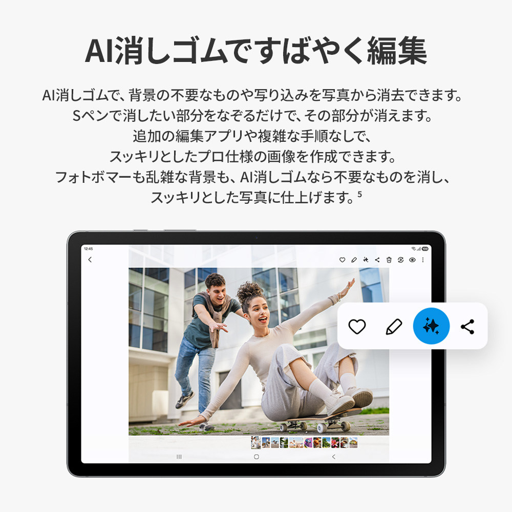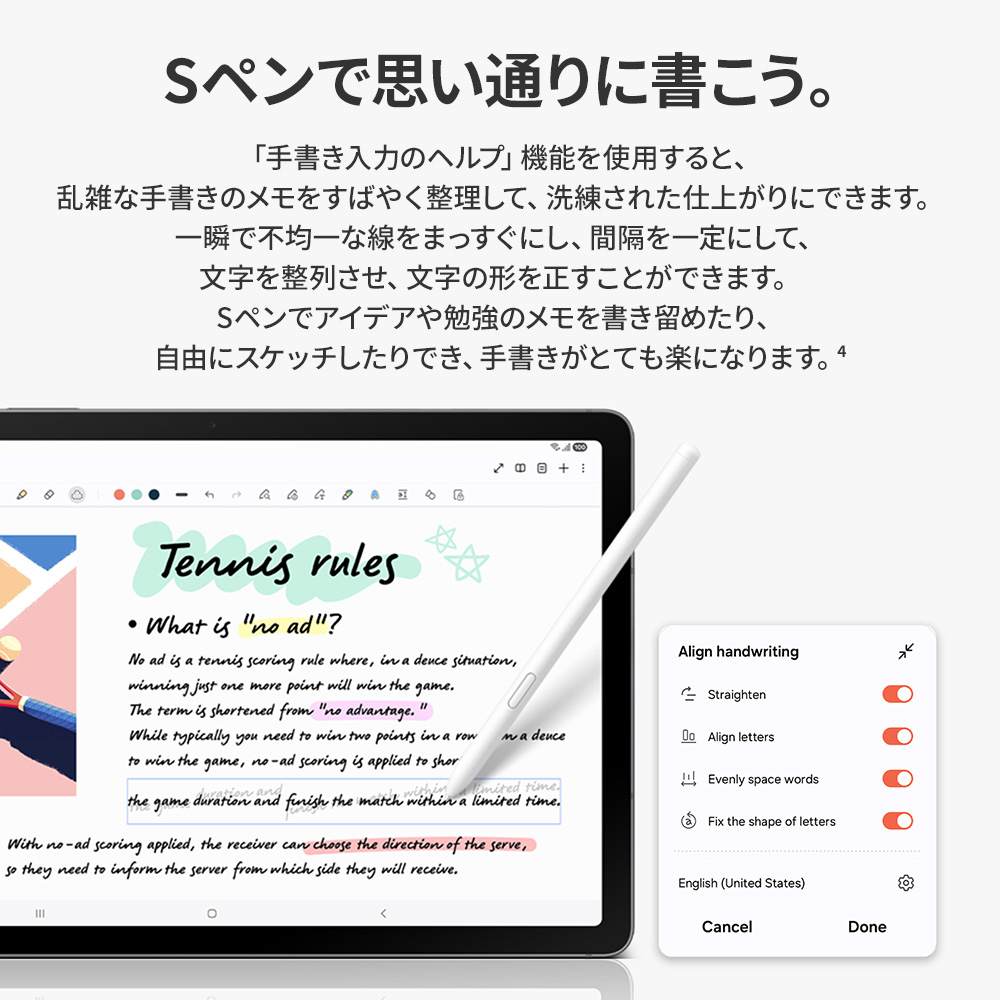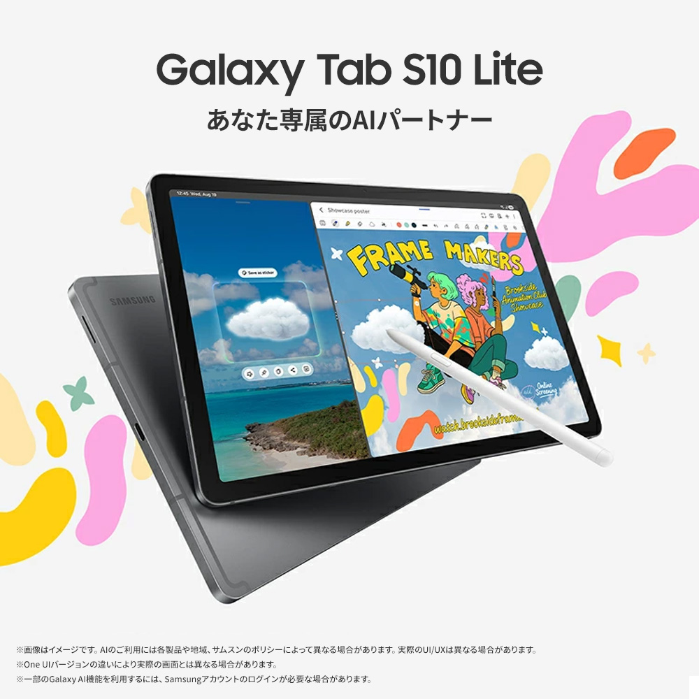 | * 画像はイメージです。実際のUX/UIとは異なる場合があります。 ※製品の画像・仕様につきましては、予告なく変更する場合がございます。 1. *モデル展開は国、地域、キャリアによって異なる場合があります。*Galaxy Tab S10 Liteのディスプレイサイズ10.9インチは、長方形の対角線を測った長さです。*Galaxy Tab S10 Liteに採用されているディスプレイは、ブルーライトの有害な影響を大幅に削減する性能に基づき、SGSの「低ブルーライト」認定を取得しています。 2. *画像はイメージです。実際のUIとは異なる場合があります。*ストレージのオプションと利用可否は、国や地域またはキャリアによって異なる場合があります。*実際に利用可能なストレージ容量は、プリインストールされているソフトウェアによって異なる場合があります。*6GBメモリと128GBストレージのみとなります。*MicroSDカードは別売りです。どのモデルも、最大2TBのストレージ容量のmicroSDカードに対応しています。外部メモリはメディア(写真、動画、音楽ファイル)の保存に使用できます。利用可否は国やメーカーによって異なる場合があります。 3. *画像はイメージです。実際のUIとは異なる場合があります。*「数式ソルバー」機能はデバイスで実行されるためインターネットへの接続は不要ですが、Samsungアカウントへのログインが必要です。手書きの誤認識によって、計算誤りが生じる恐れがあります。*数式ソルバーのご利用には、Samsung Notesアプリで機能をオンにする必要があります。オンにするには、[その他のオプション]メニューを選び、[数式ソルバーをオン]をタップします。 4. *画像はイメージです。実際のUIとは異なる場合があります。*「手書き入力のヘルプ」機能はデバイスで実行されるためインターネットへの接続は不要ですが、Samsungアカウントへのログインが必要です。*結果の精度は保証されません。現在、「手書き入力のヘルプ」機能は、アラビア語、ドイツ語、英語(オーストラリア)、英語(英国)、英語(米国)、英語(インド)、スペイン語(スペイン)、スペイン語(メキシコ)、スペイン語(米国)、フランス語(カナダ)、フランス語(フランス)、ヒンディー語、インドネシア語、イタリア語、日本語、オランダ語、ポーランド語、ポルトガル語(ブラジル)、ポルトガル語(ポルトガル)、ルーマニア語、ロシア語、スウェーデン語、タイ語、トルコ語、ベトナム語、中国語(中国本土)、中国語(香港)、中国語(台湾)、韓国語に対応しています。 5. *画像はイメージです。実際のUIとは異なる場合があります。* AI消しゴムツールは、編集ツールに表示される前に有効にしておく必要があります。*仕上がりは、照明や背景など、写真の状態により異なる場合があります。 6. *第三者機関のラボで実施された試験における代表値。標準数値は、IEC 62133規格に基づく試験におけるバッテリーサンプル間の容量偏差を考慮した推定平均値です。Galaxy Tab S10 Liteの標準バッテリー容量は8,000mAhです。実際のバッテリー寿命は、ネットワーク環境、利用状況、その他の要因により異なる場合があります。*急速充電の速度は、充電条件およびその他の要因によって異なる場合があります。*付属のSamsungデータケーブルの使用をお勧めします。 |
