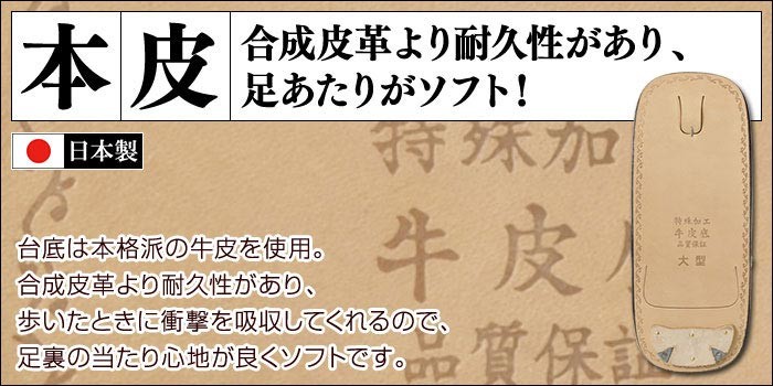 その革を鼻緒にだけあしらって、ある意味贅沢な使い方。
