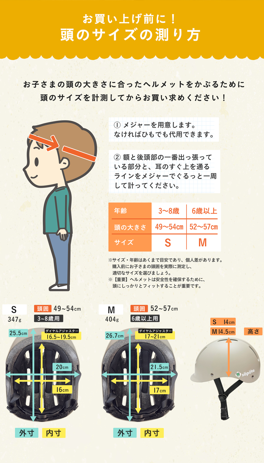 お子さまの頭に合ったサイズのヘルメットをかぶるために 商品画像を参照し、頭のサイズを計測してからお買い求めください。
