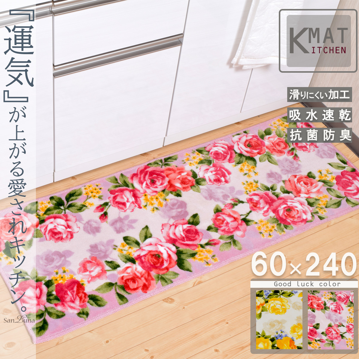 キッチンマット ラインローズ 60×240cm 洗える 滑り止め 抗菌 防臭 吸水 速乾 台所 キッチン ラグ カーペット 黄色 ピンク イエロー 花柄 カットオーダー 対応