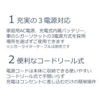 ・充実の3電源対応:3電源方式を採用(家庭用AC電源、充電式内蔵バッテリー、車のシガーソケット)。場所を選ばずご利用できます。