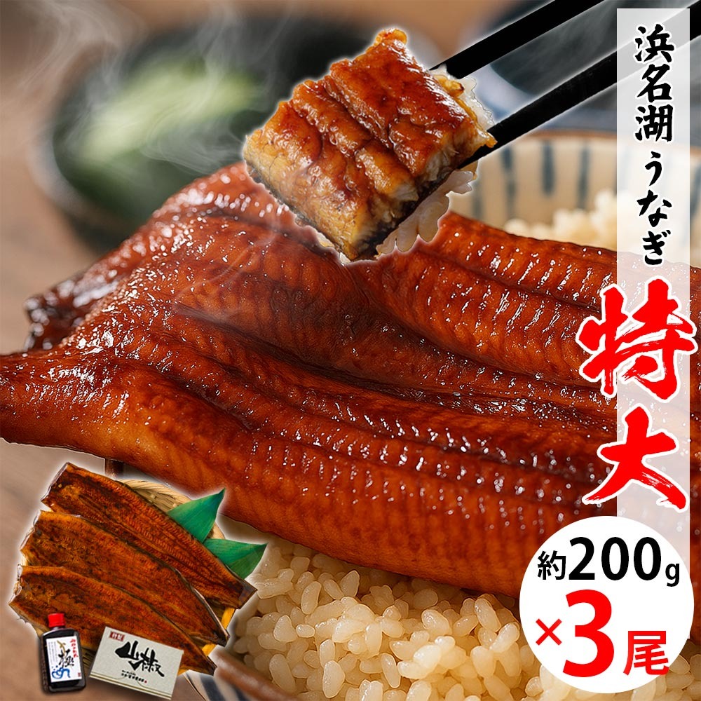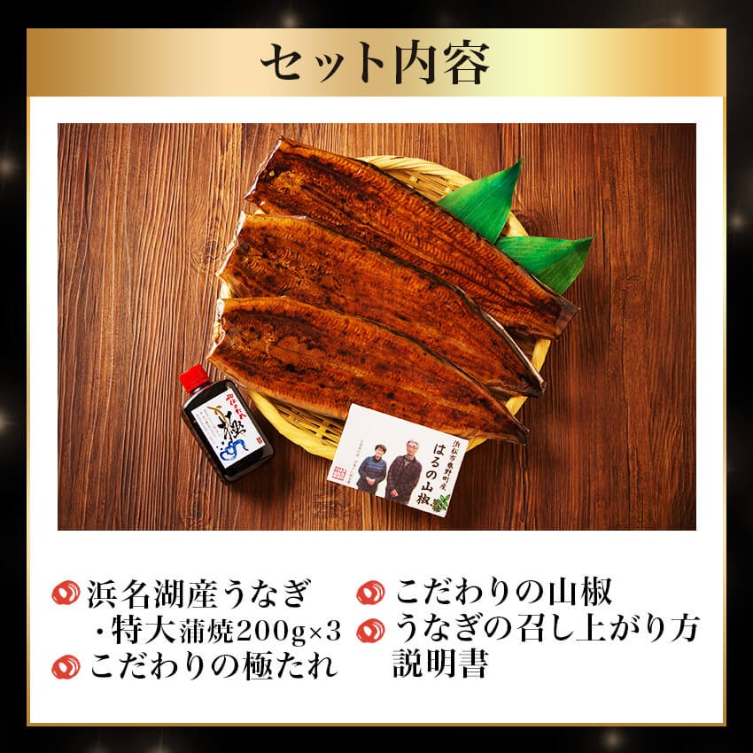 うなぎ特大蒲焼 約200g×3袋、うなぎ蒲焼きのたれ100ml×1、こだわりの山椒(0.2g×5袋)×1