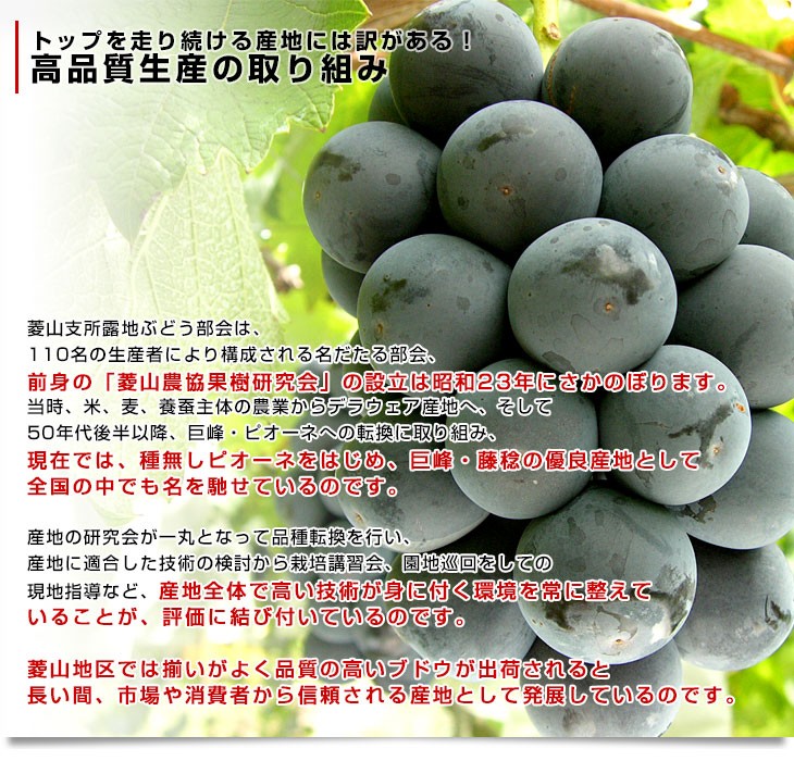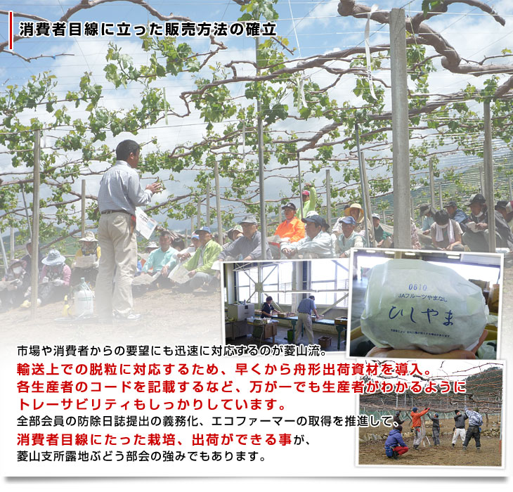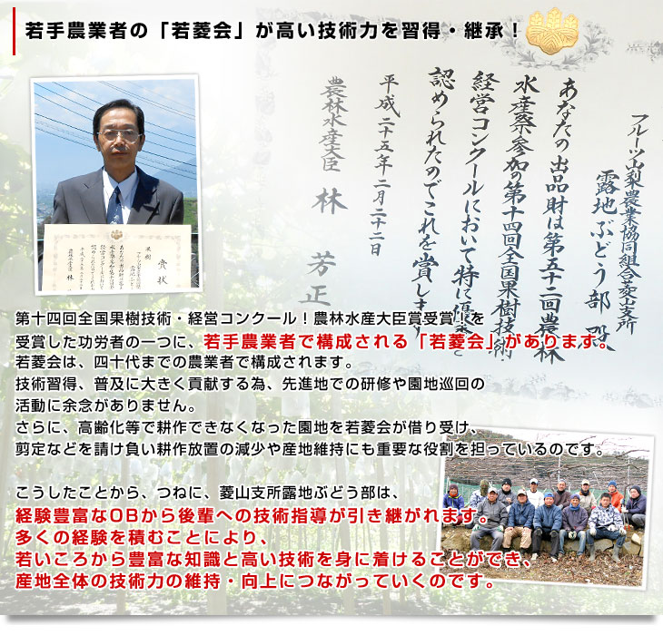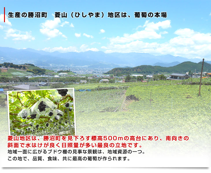 菱山地区は、勝沼町を見下ろす標高500mの高台にあり、南向きの斜面で水はけが良く日照量が多い最良の立地です。地域一面に広がるブドウ棚の見事な景観は、地域資源の一つ。この地で、品質・食味共に最高の葡萄が作られます。