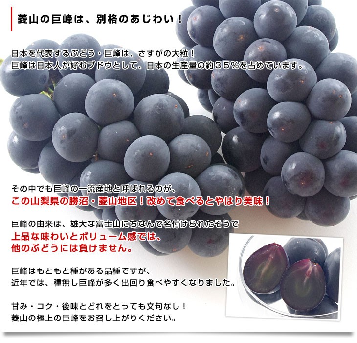 菱山地区は、勝沼町を見下ろす標高500mの高台にあり、南向きの斜面で水はけが良く日照量が多い最良の立地です。地域一面に広がるブドウ棚の見事な景観は、地域資源の一つ。この地で、品質・食味共に最高の葡萄が作られます。昔から大人気の巨峰!上品な味わいとボリューム感で他のブドウを圧倒します。