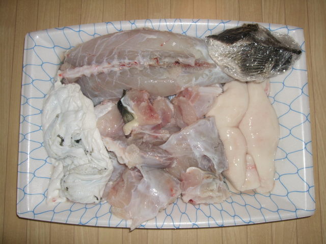 サンチョクの活けトラフグみがき(白子入り)4人前(1.1〜1.3キロの活けトラフグ使用)多少白子に大小があります。●皮 皮引き済 約70グラム ●ヒレ(乾燥済み)サンチョクのトラフグは福井県産です。常に8トンと5トンの水槽で活かしています。ご注文即調理して出荷致しております。これからは大きな白子入りの美味しいトラフグが楽しめます。お客様一人一人に一生懸命ご奉仕させていただくつもりです。当店は「ふぐ調理師免許」を取得しておりますので安心してお求めください。