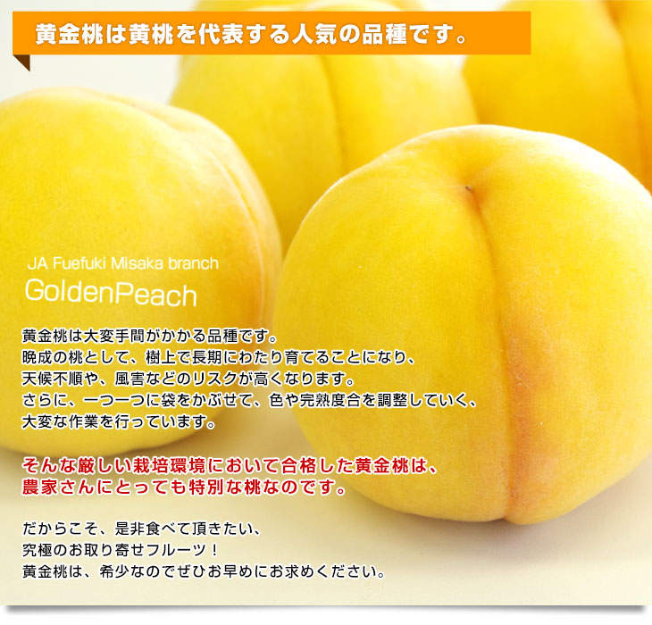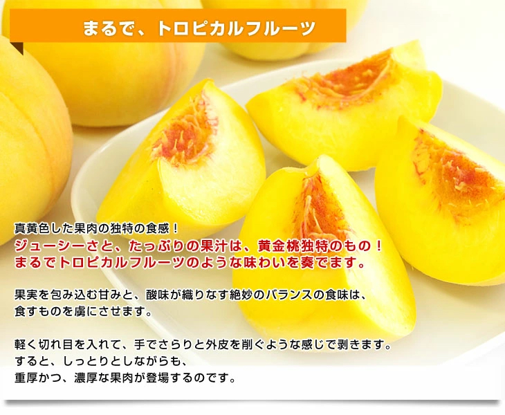 桃どころ山梨の希少な極上桃「黄金桃」。色鮮やかな黄色い果肉と、まるでトロピカルフルーツのような濃厚な美味しさが魅力!芳醇な甘みと緻密な果肉、そして華やかな香りをお楽しみください。贈り物にも最適な、高級感漂う化粧箱でお届けいたします。