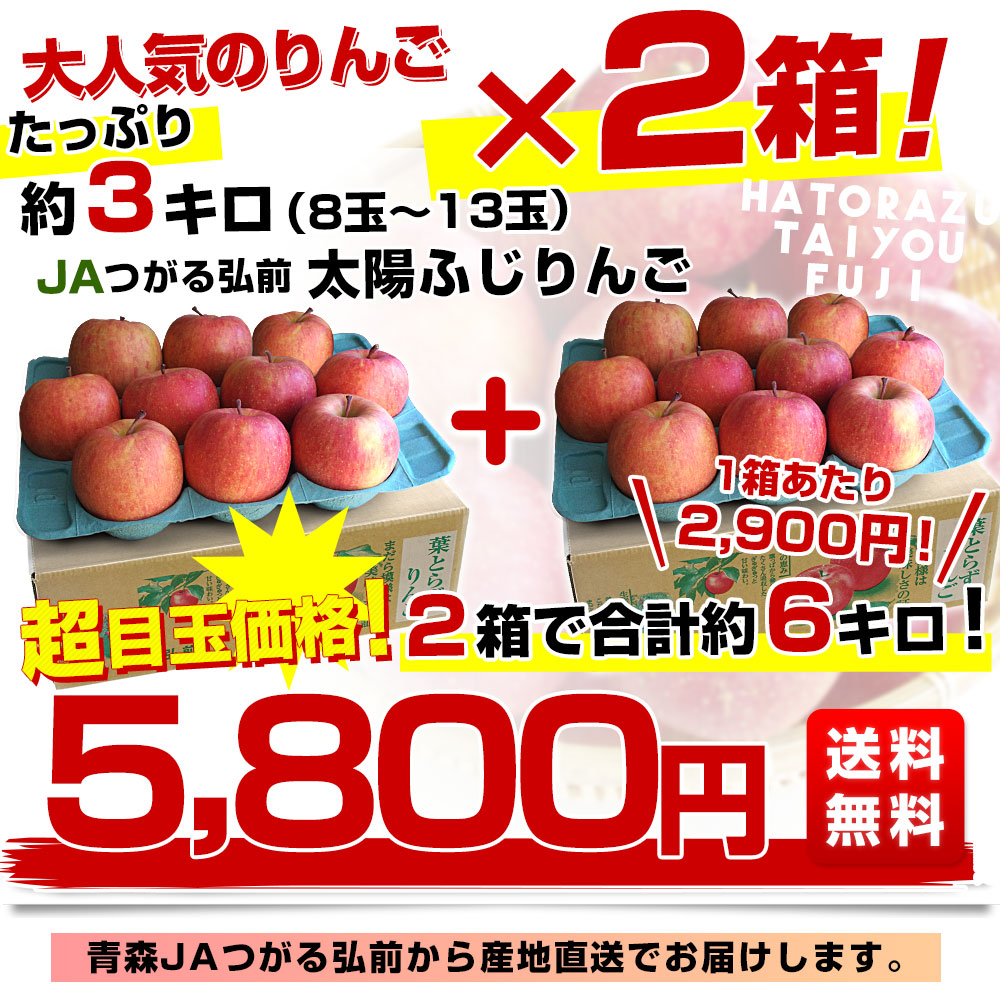 青森県から産地直送 JAつがる弘前 葉とらず太陽ふじりんご 3キロ(8玉から13玉×2箱) 糖度13度以上 林檎 リンゴ 送料無料