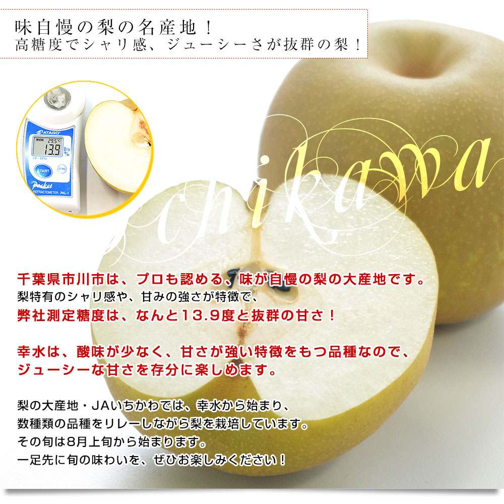千葉県市川市は、プロも認める梨の大産地。日照時間の長さと昼夜の寒暖差の大きさから梨栽培の最適地でもあります。市川の梨は、溢れ出すジューシーな果汁が詰まっていて、一個食べれば体中が潤うような果汁感と、強い甘さがたまりません!