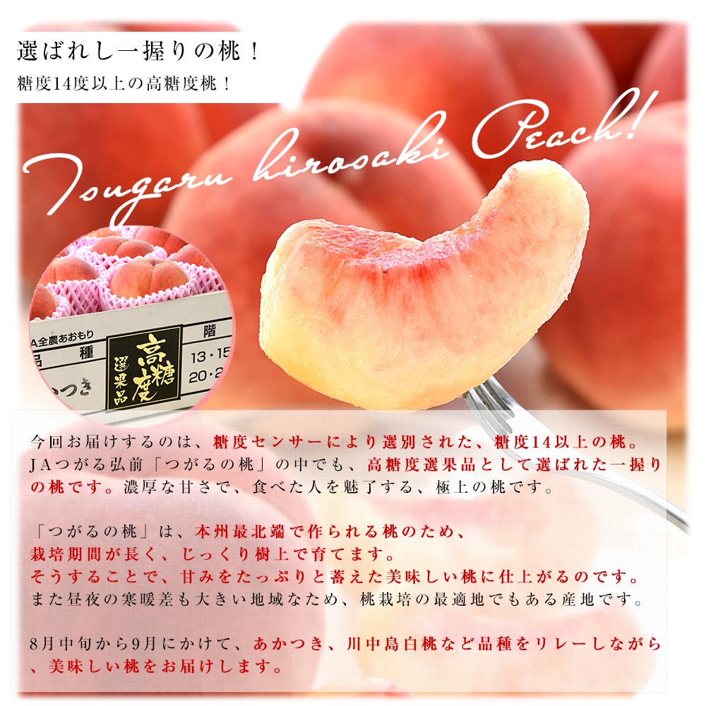 糖度センサーにより選別された、糖度14以上の桃をお届けします。JAつがる弘前「つがるの桃」の中でも、高糖度選果品として選ばれた一握りの桃です。「つがるの桃」は、本州最北端で作られる桃で、栽培期間が長くじっくり樹上で育てるため、甘みをたっぷりと蓄えた美味しい桃に仕上がります。ぜひご賞味ください。