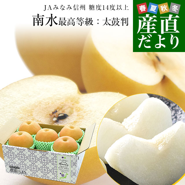 「南水(なんすい)」は、長野県JAみなみ信州管内にある県農業試験場で誕生した南信州生まれの梨です。今回お届けする「南水」は、JAみなみ信州の中でも、糖度14度以上の高糖度で、かつ外観の基準も満たした最高等級の「太鼓判」です。「南水」発祥の地で作る、激甘な梨をぜひご賞味ください。