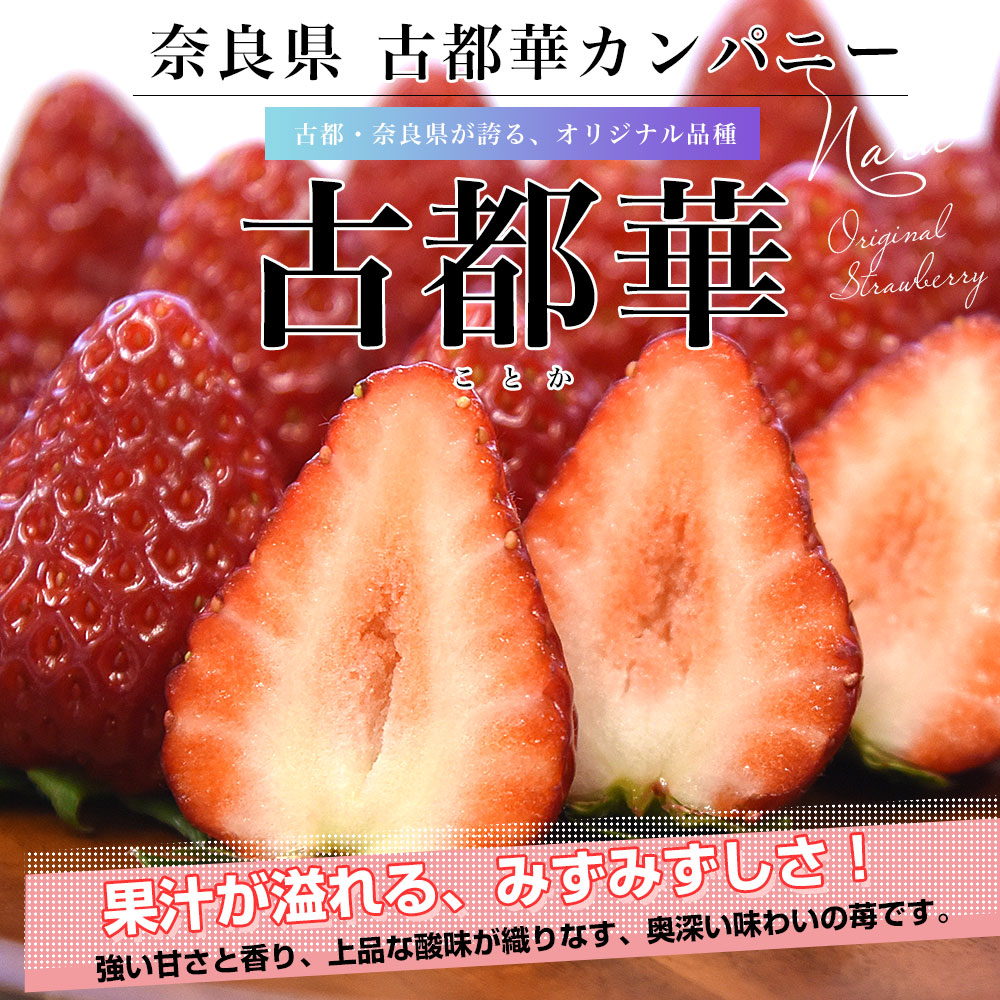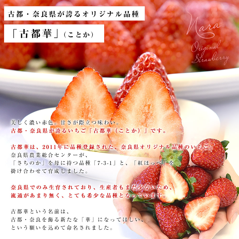 古都華は、2011年に品種登録された、奈良県オリジナル品種のいちごです。甘さが格別で、一般的ないちごを大きく上回る濃厚な甘み。弊社測定では、糖度16.3度も!あま〜い果汁と高い香りが広がるその味わいは、まさに絶品。上品な酸味もあり、甘さを引き立たせ、濃厚かつ、いちご本来のおいしさや味を堪能できます。
