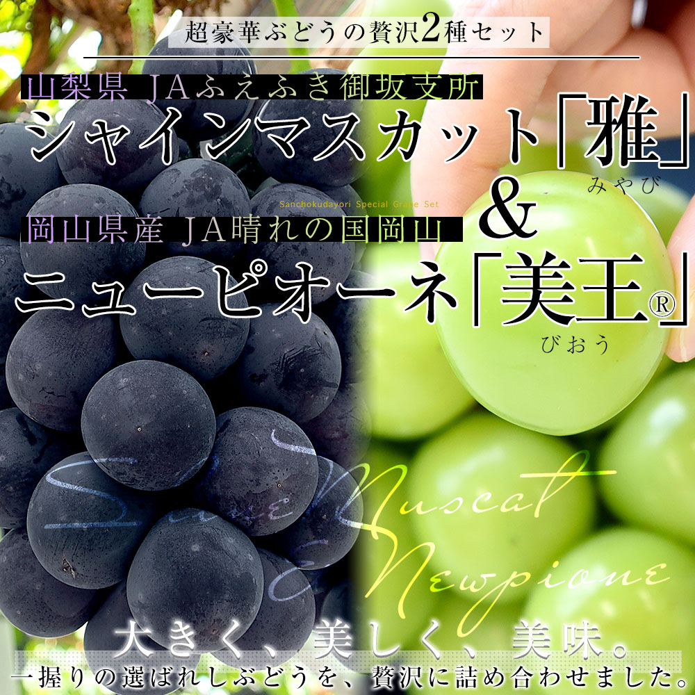 一握りの選ばれし究極のぶどうが、贅沢に詰め合わせ!大粒かつ、美しい翡翠色、爽やかで濃い甘さが特徴の山梨県産シャインマスカット「雅」。濃い黒色の、コクのある旨みが詰まった、岡山県産ニューピオーネ「美王(R)」。