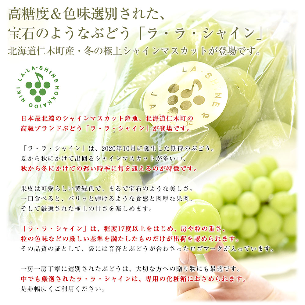 高糖度選別品!北海道で生まれた冬の極上シャインマスカット「ラ・ラ・シャイン」が登場です。弾けるような食感と肉厚な果肉、そして厳選された極上の甘さを楽しめます。丁寧に育てられたぶどうは、まるで宝石のような美しさ!ギフトにも是非ご利用ください。