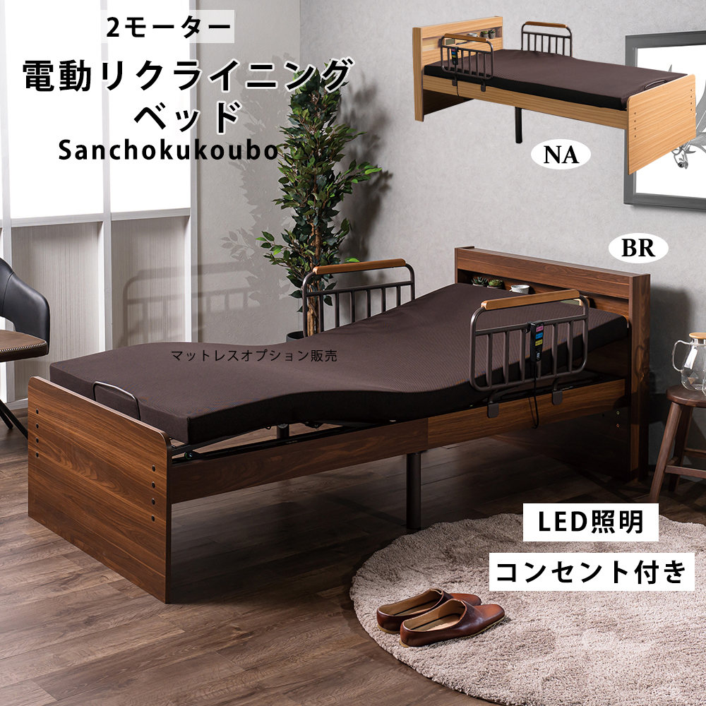 商品説明 | 電動リクライニングベッドは、介護の現場での使用に最適な機能を備えています。 2モーターによるスムーズなリクライニング機能により、利用者の快適な姿勢をサポートします。 床高調整が可能で、介護者の負担を軽減します。 コンセントとLED照明が付いており、利便性が高まっています。 ナチュラルとブラウンの2色展開で、インテリアに合わせて選べます。 組み立てはお客様作業となります。 介護ベッドは非課税です ベッド中国工場製作