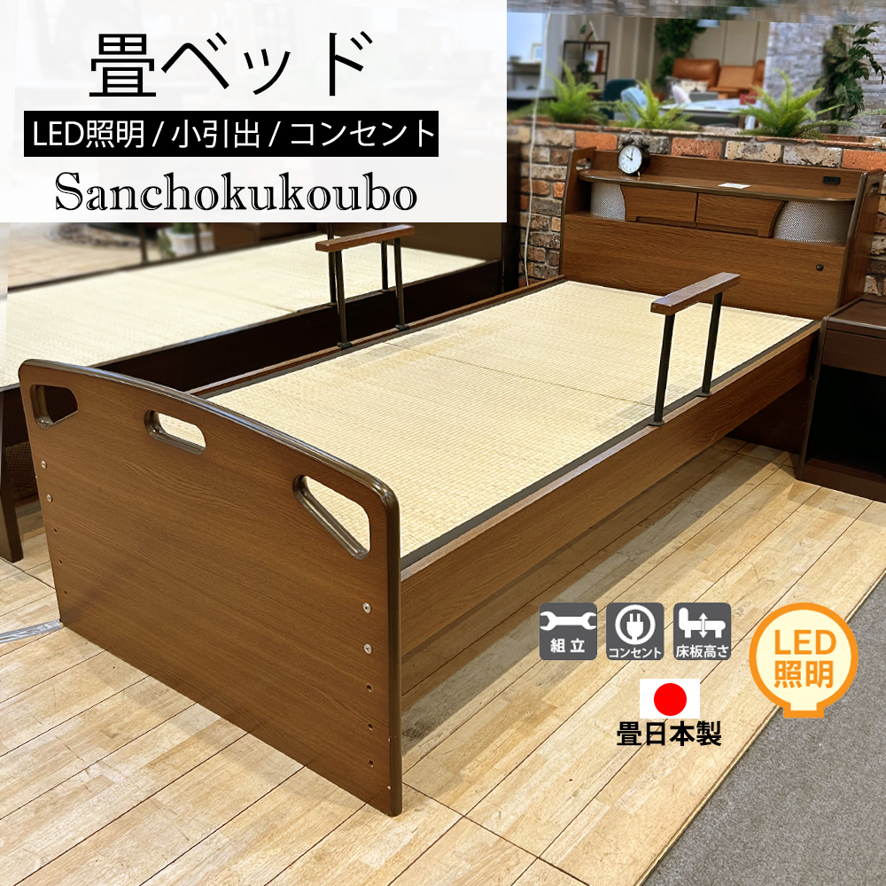商品説明 | 畳ベッドは、和の風合いを大切にした高級感あふれるデザインが特徴です。 国産畳を使用し、産地直送でお届けします。 手すりが2本付いており、安全性を高めています。 高さ4段階調整可能です。 LED照明とコンセントが付属し、機能性も充実。 小引出しも備え、収納にも便利です。 高さは4段階で調整可能で、幅100cm、長さ220cmのシングルサイズ。 畳好きな方におすすめの一品です。 フレームは中国工場製作で畳は国産です。
