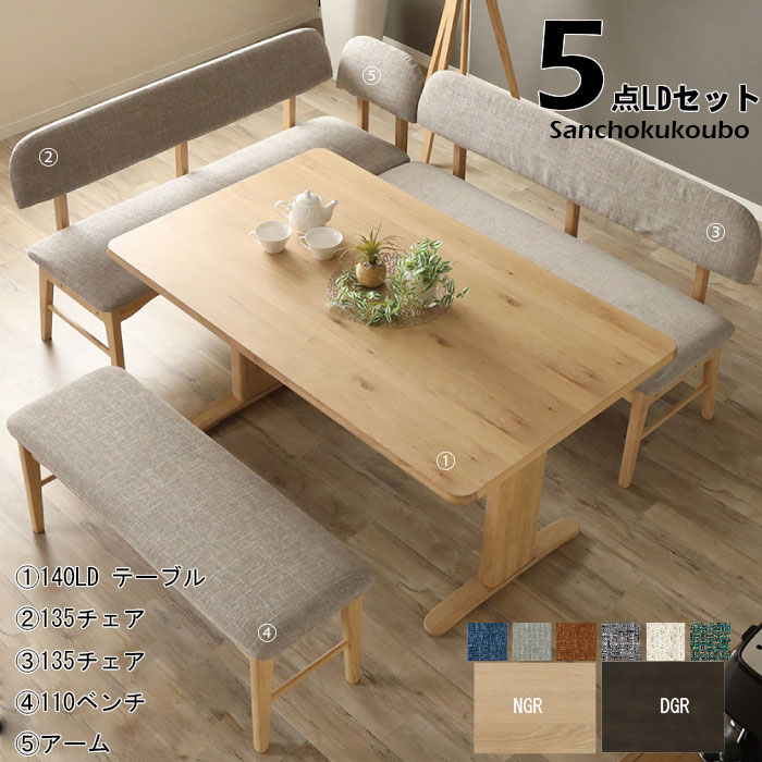 LAV リビングダイニング LD5点セット 140テーブル + 135チェア×2 + 110チェア + アーム オーク突板 NGR DGR ファブリックカバー付き 6色 LD 食卓 K=20000