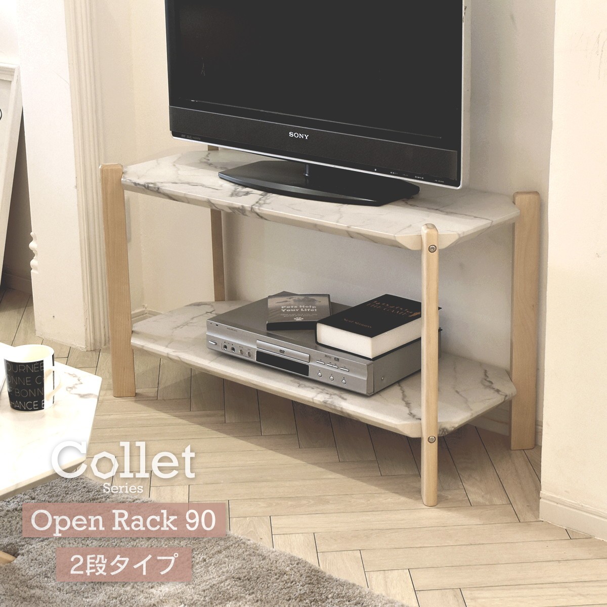 オープンラック 2段 ラック 収納 棚 本棚 おしゃれ 幅 90cm 大理石 調 木製 エレガント ウレタン塗装 ラグジュアリー 北欧 シンプル 天然木 一人暮らし 新生活