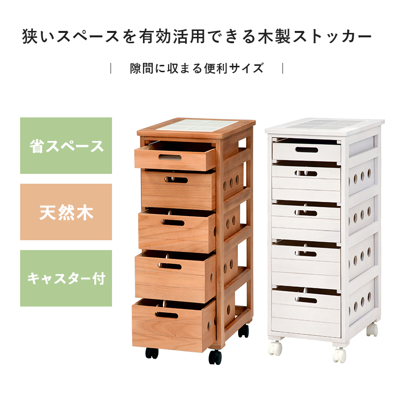 タイルキッチンワゴン 隙間収納 幅 30cm ナチュラル ホワイト キッチンストッカー スリム おしゃれ キャスター付き 木製 天板 タイル 5段 新生活