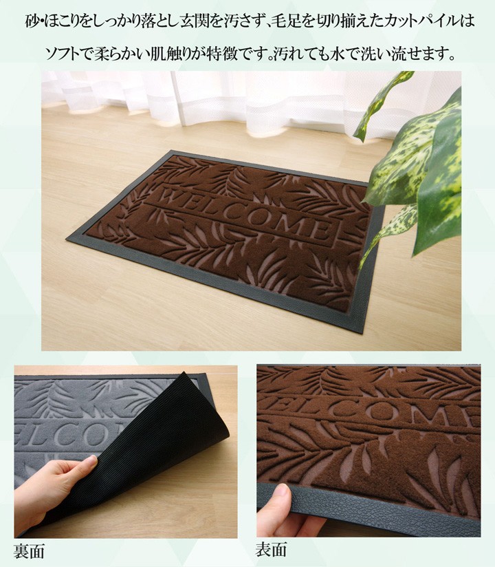 洗える 屋外用 外用 玄関マット おしゃれ Welcome ブラウン 長方形 薄型 裏 ゴム パイル かわいい ドアマット エントランスマット 新生活