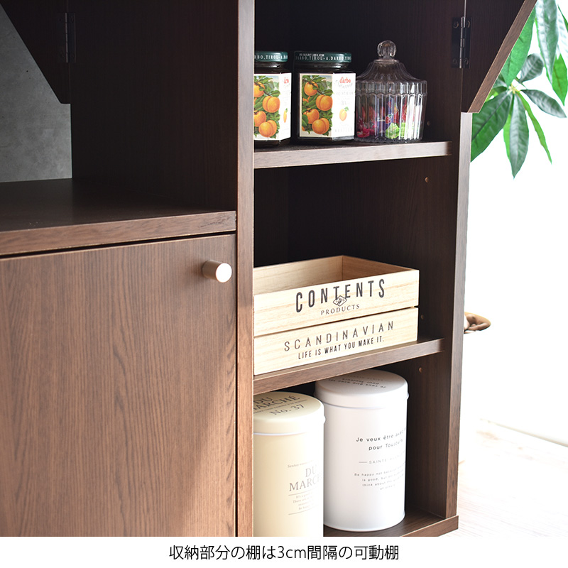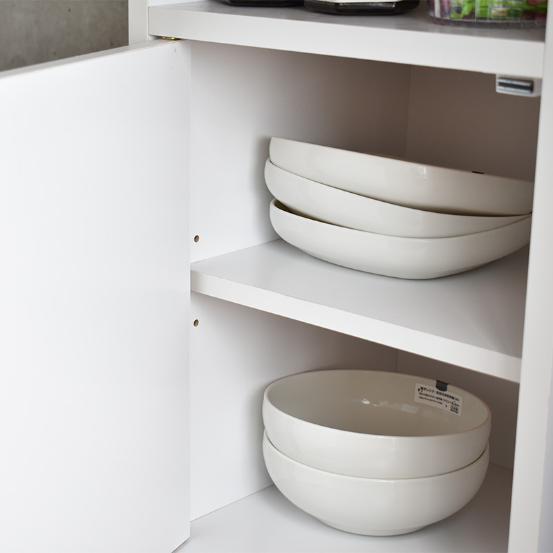 扉収納は、可動棚1枚付。中身を隠せてホコリも防ぎ、食器や保存食などスッキリ収納できます。